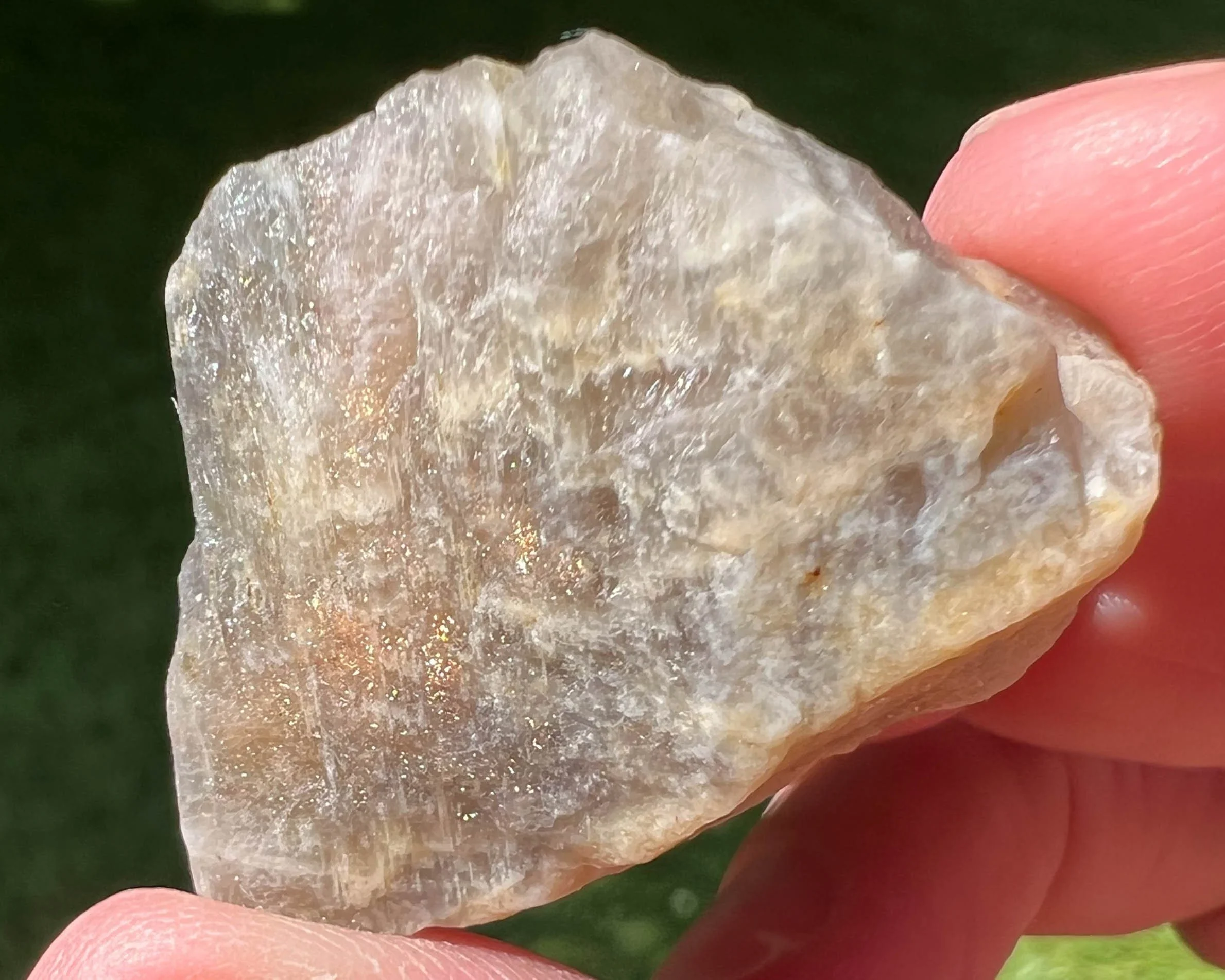 This is a beautiful rough stone with a combination of Moonstone with bright blue flash and sunstone with sparkly orange and pink "confetti" schiller. It is also called Belomorite. It is from Russia. 100% natural untreated gemstone. It is both sparkly and flashy.