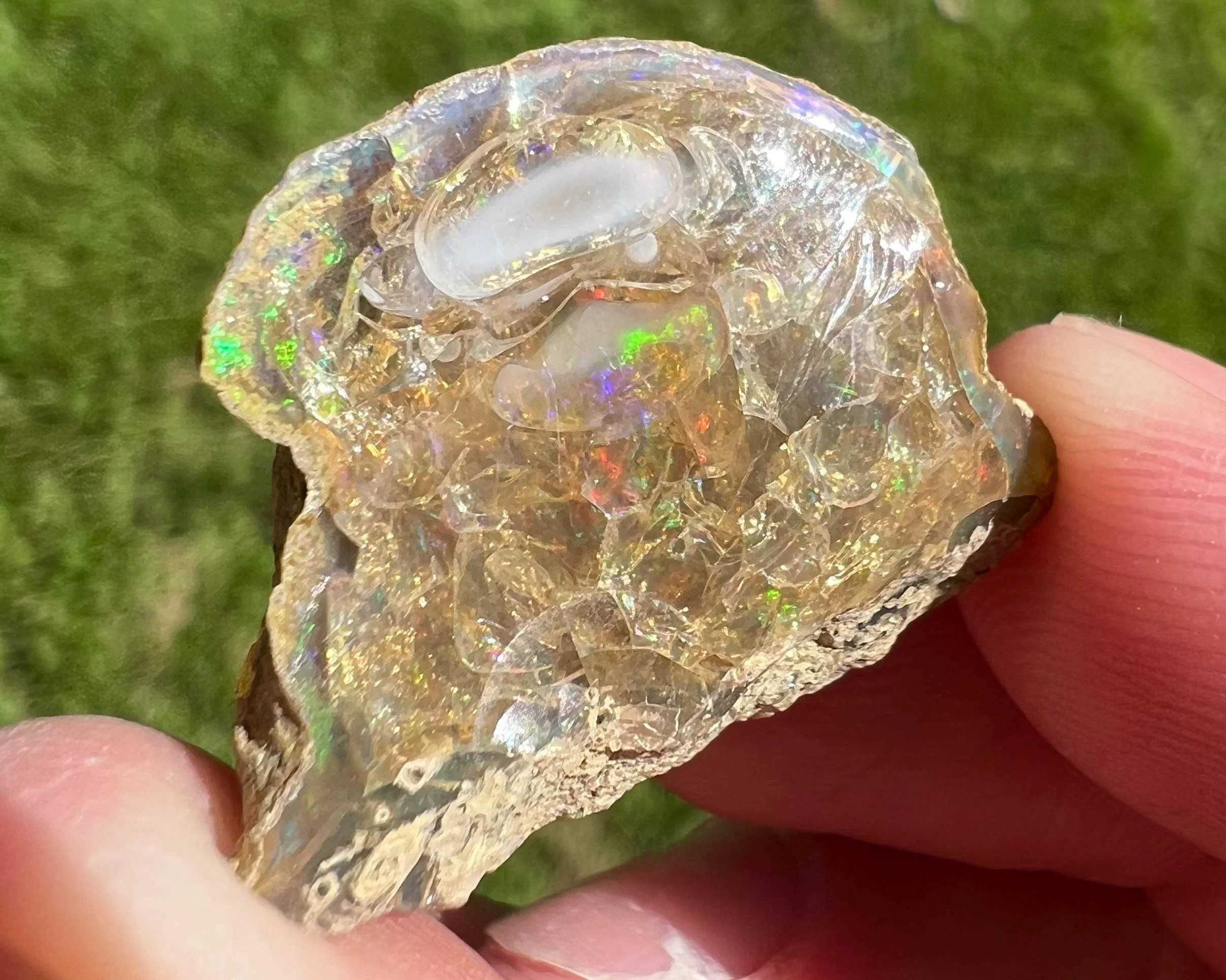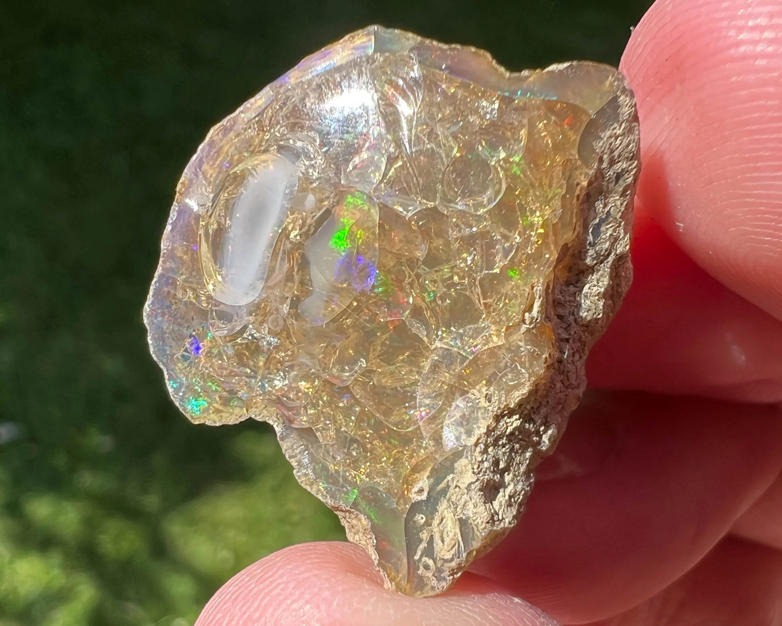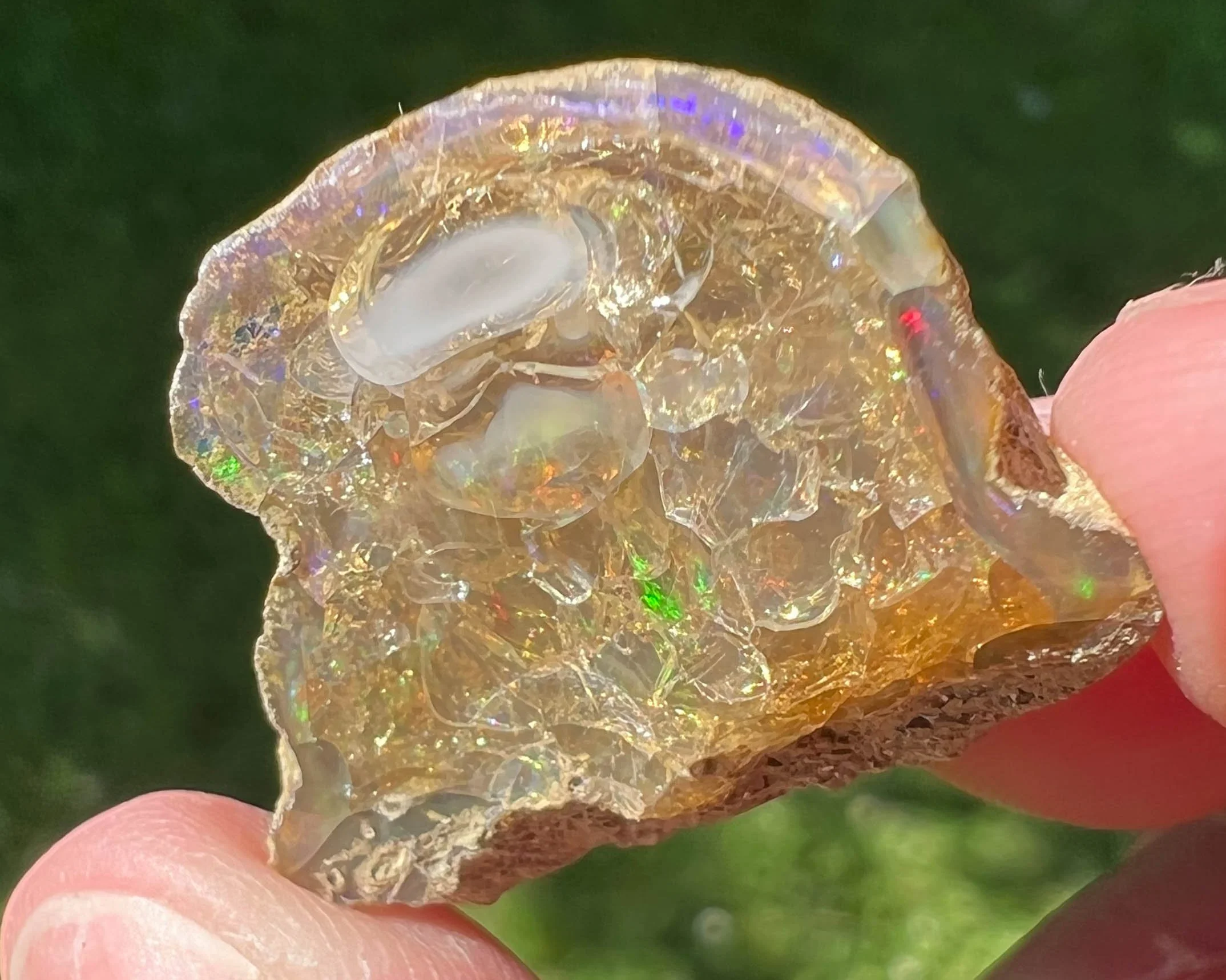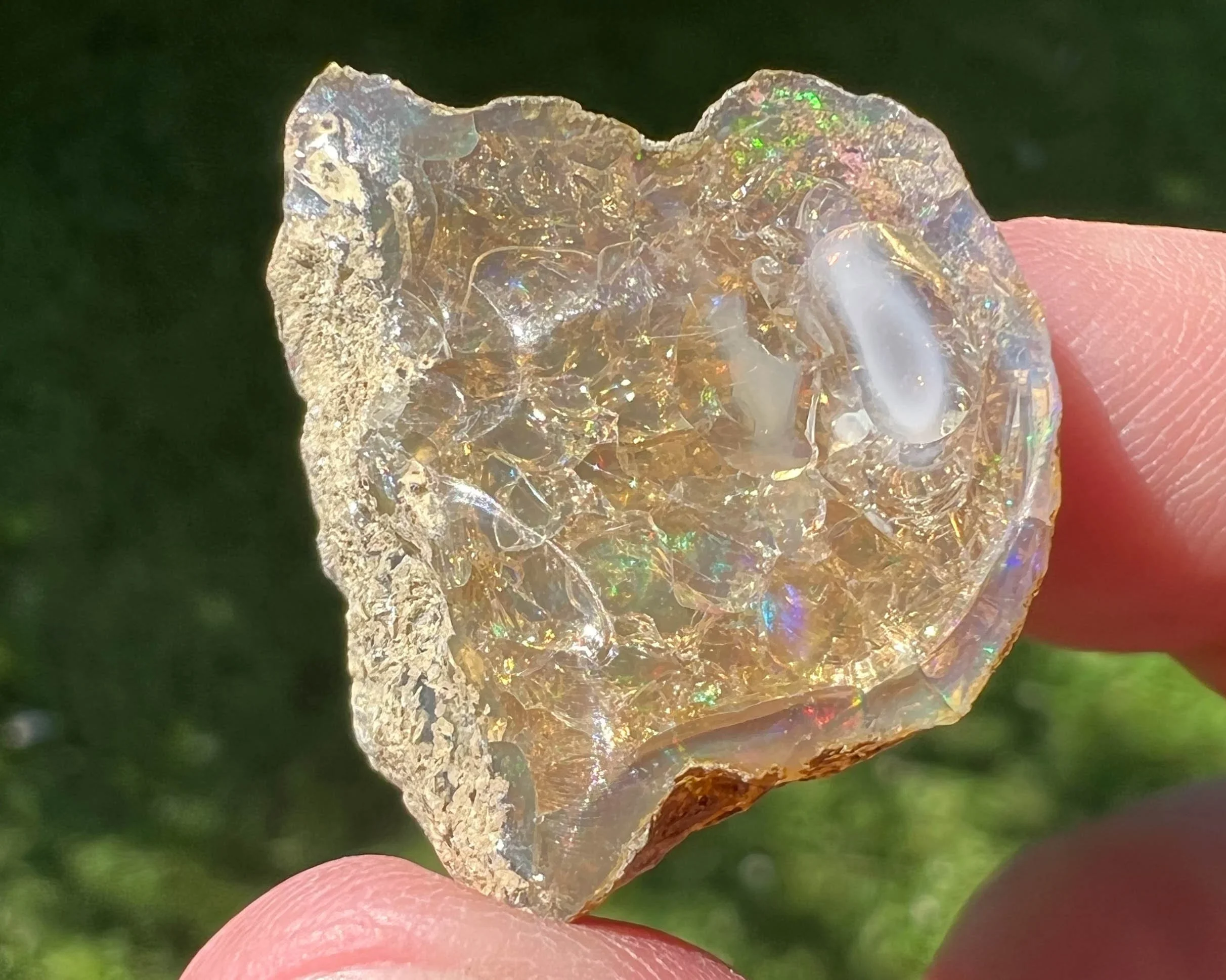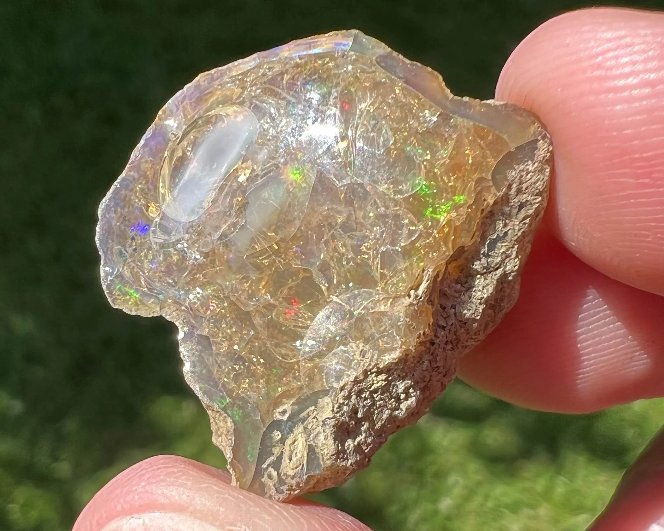 This is a very flashy rough Ethiopian Welo Opal. It is a transparent opal with full, bright rainbow flash! It has the whole rainbow sparkling brightly throughout. Very flashy and much better in person!