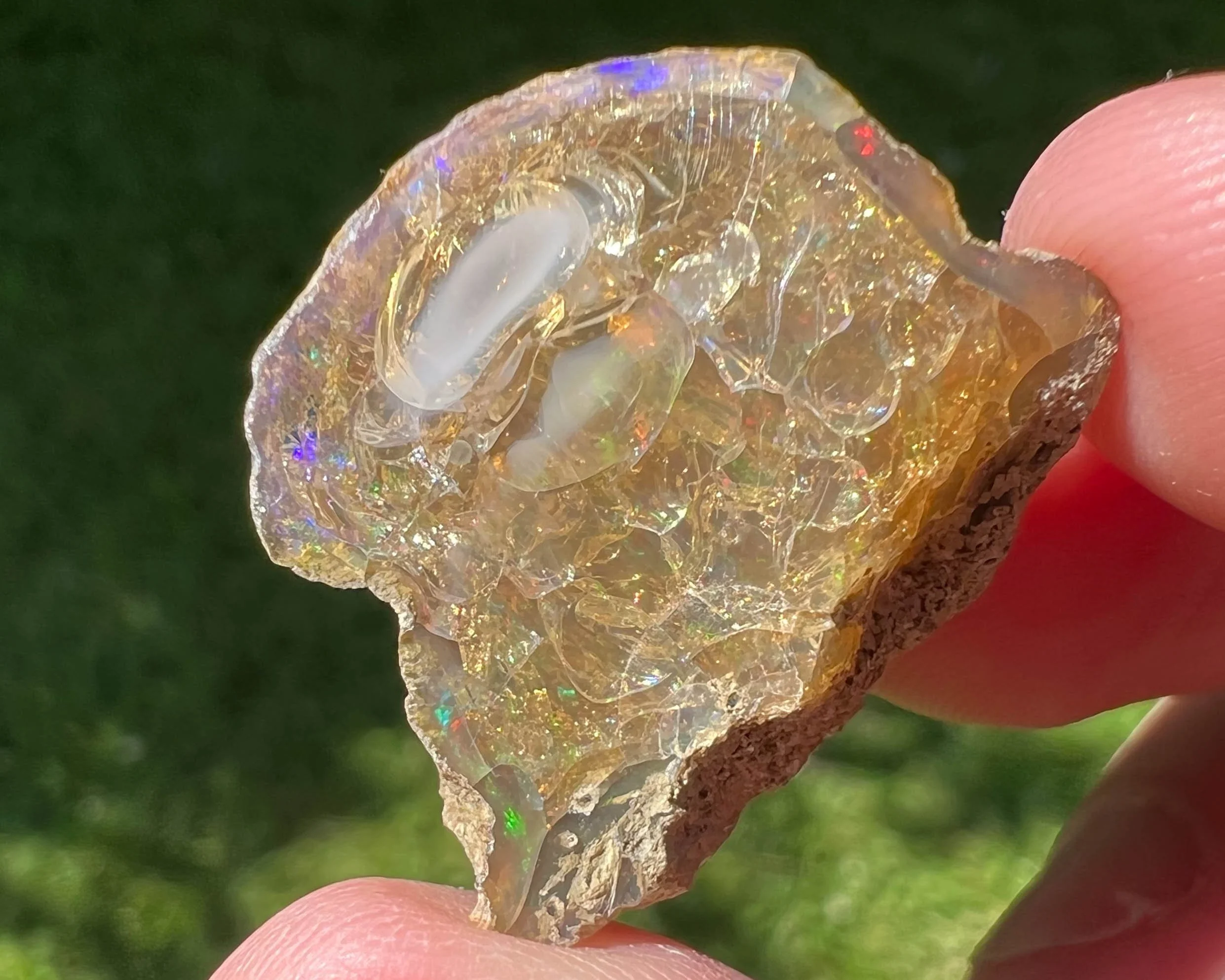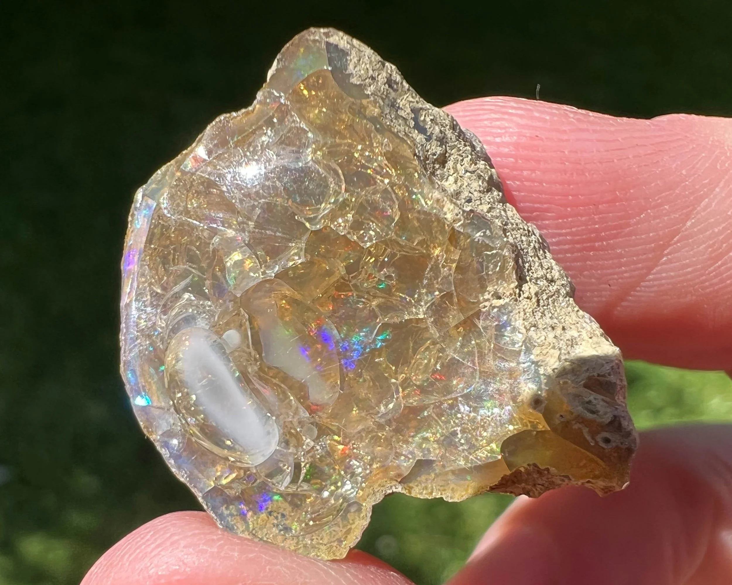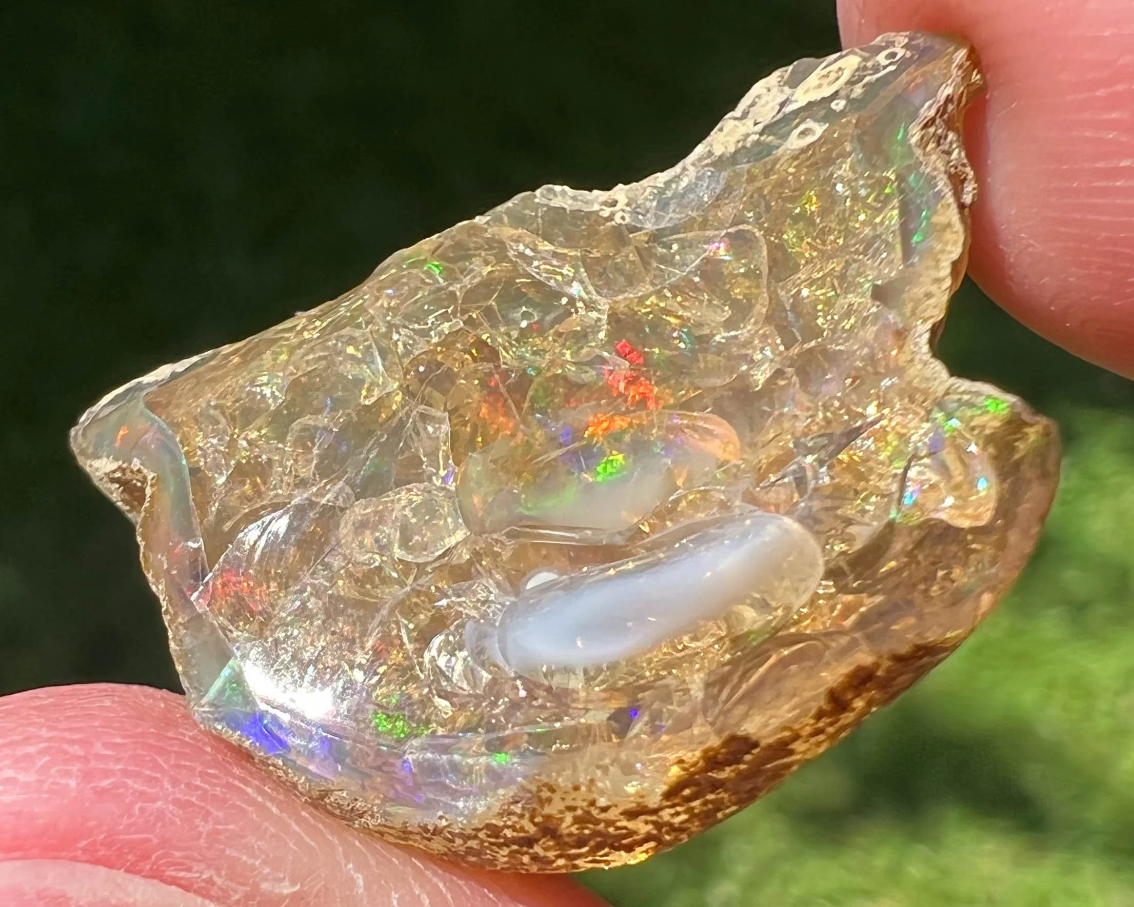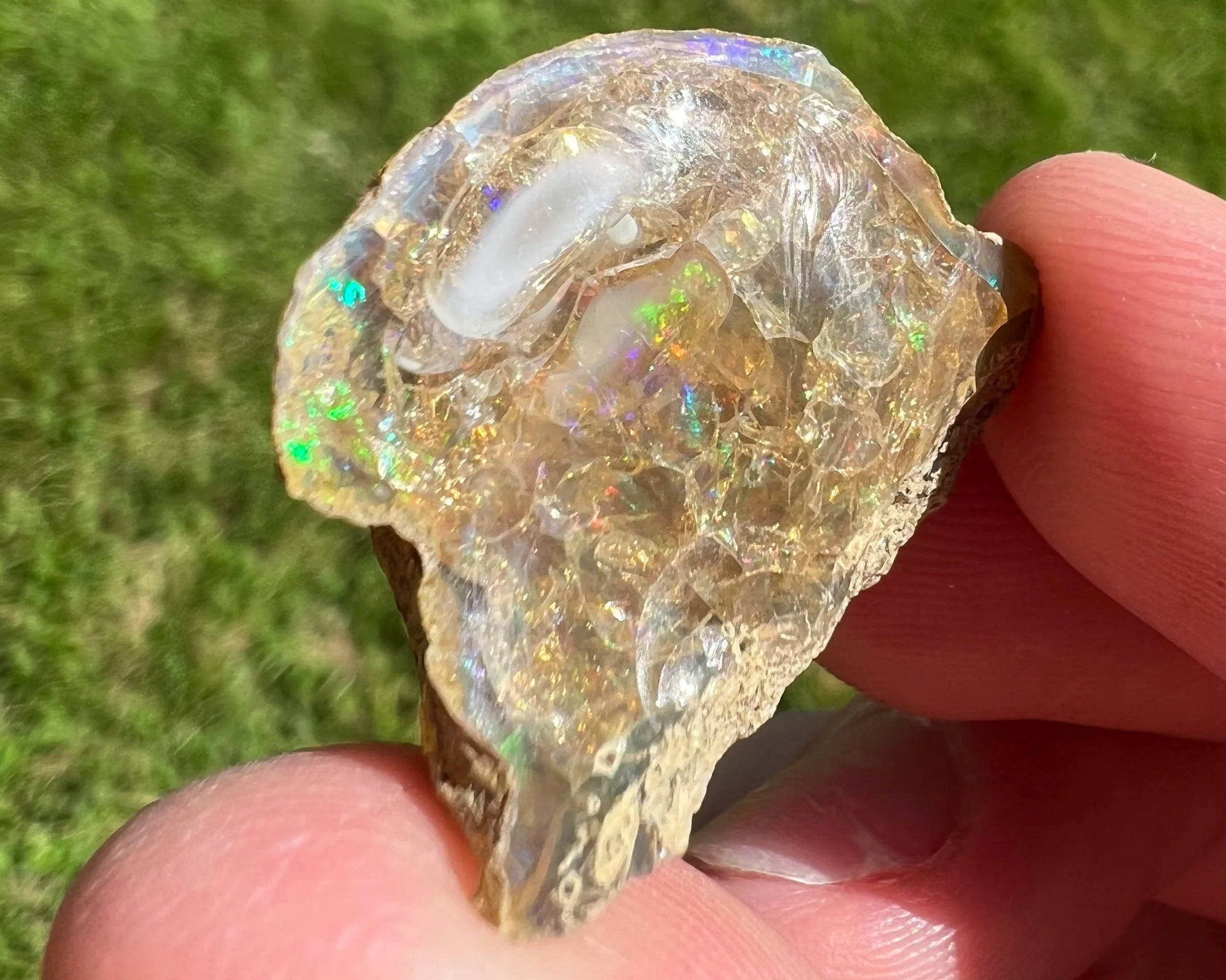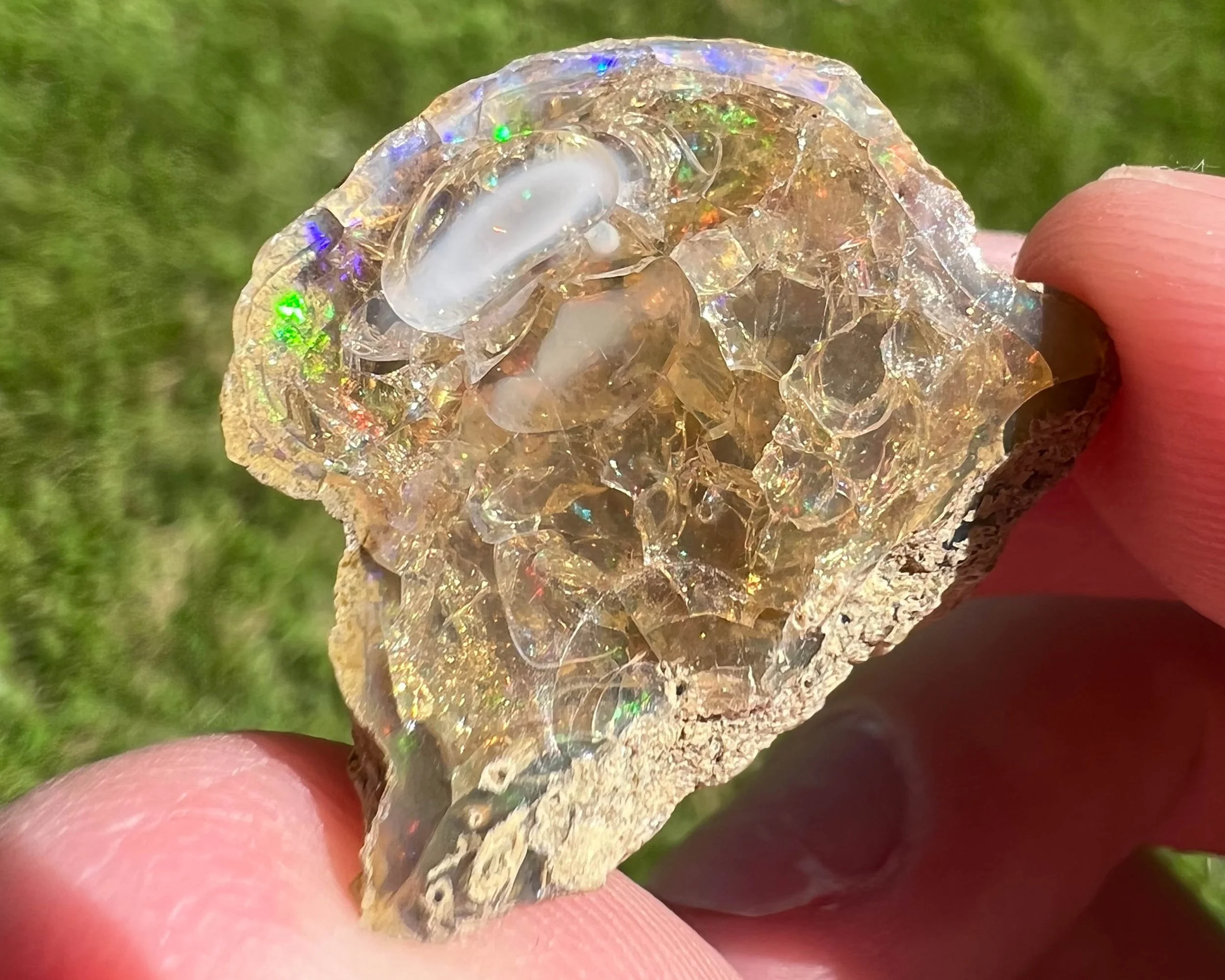 This is a very flashy rough Ethiopian Welo Opal. It is a transparent opal with full, bright rainbow flash! It has the whole rainbow sparkling brightly throughout. Very flashy and much better in person!