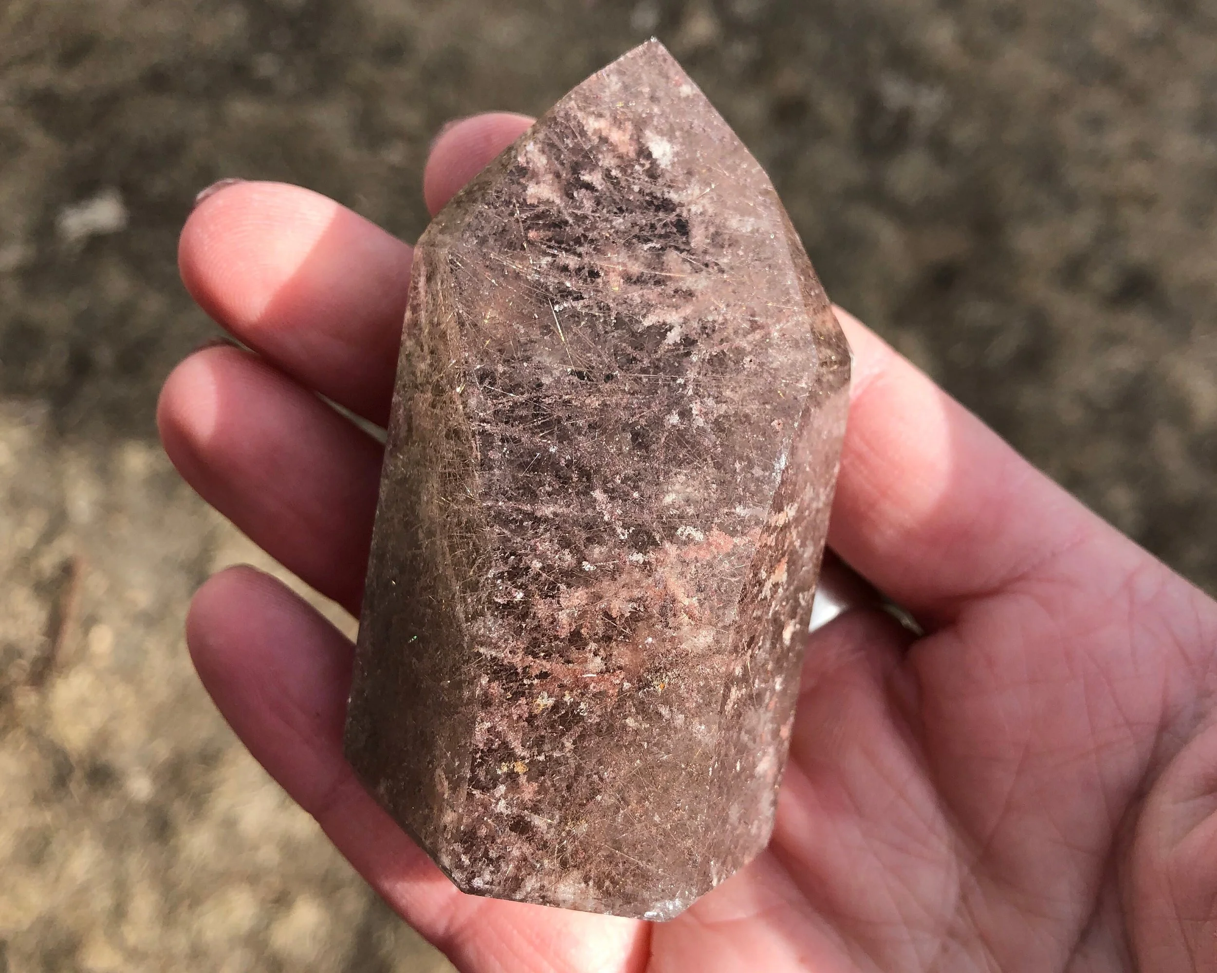 Rutilated Lodolite Quartz Crystal Tower #9 Polished Inclusion Quartz Point from Brazil, Self Standing Pink Purple Gold Rutile, Gift for Her