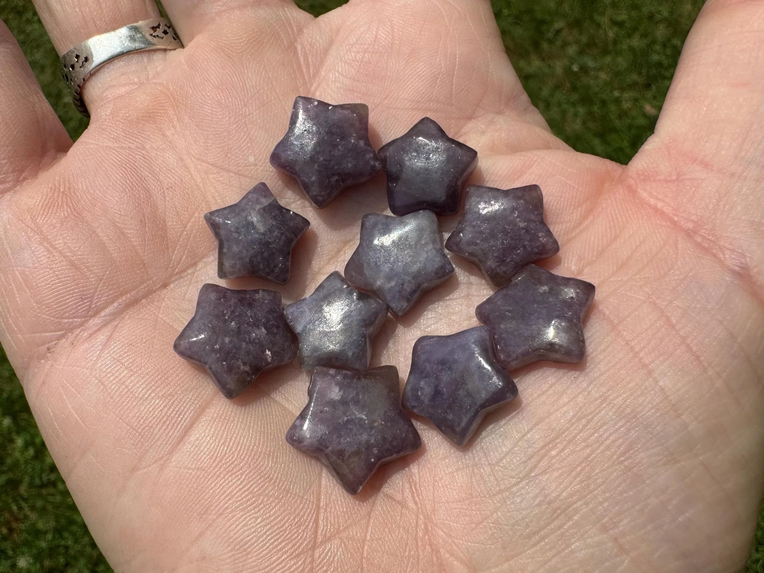 These are sweet little stars carved from natural Lepidolite. They are purple, some darker and some lighter. They are sparkly, as Lepidolite is a type of Lithium rich Mica. They are polished on all sides and edges. Very cute little carvings, perfect to gift, make jewelry, or use as cute little home decor accents.