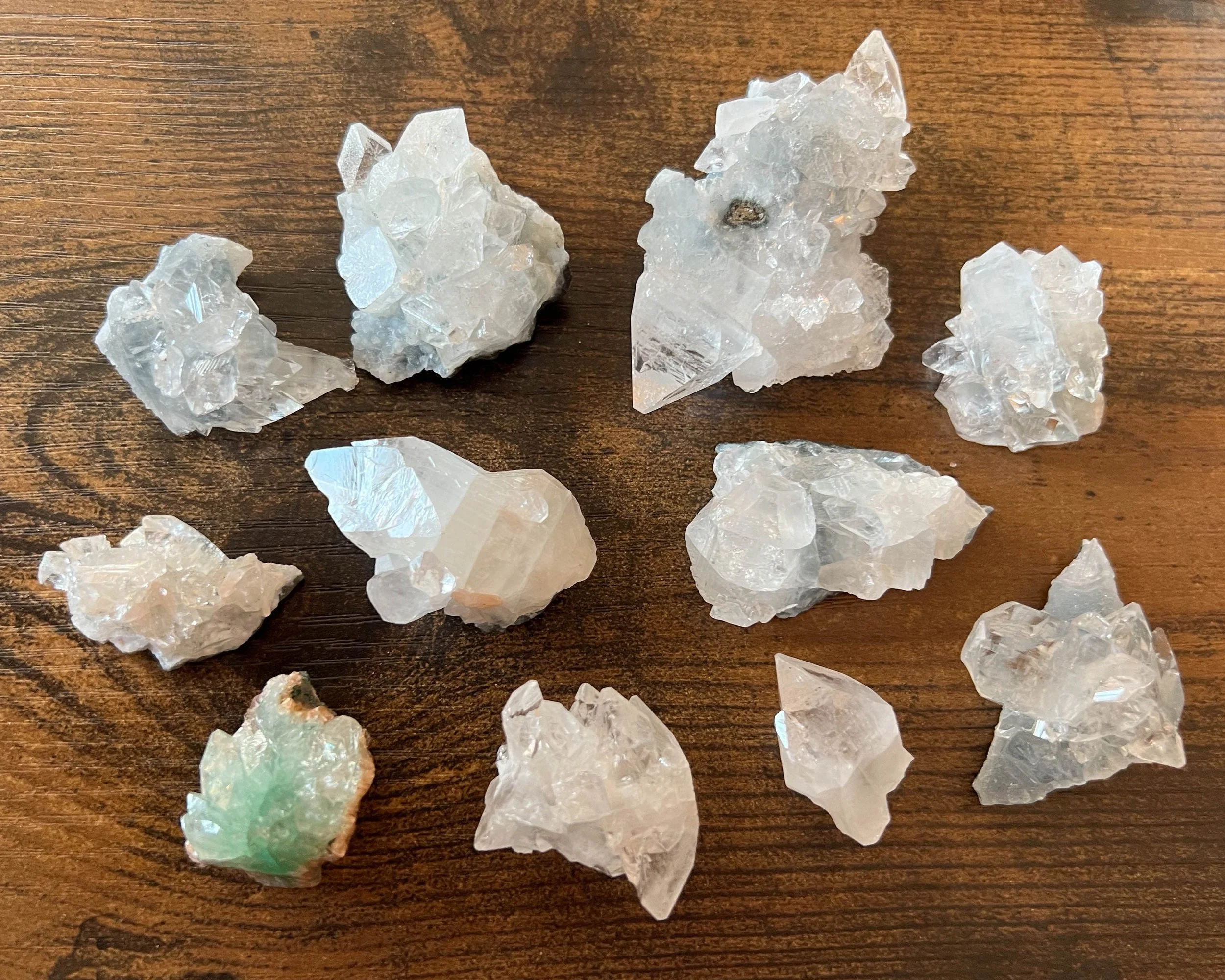 You will receive the exact 11 pieces shown making up this beautiful mineral specimen set of Indian crystals.