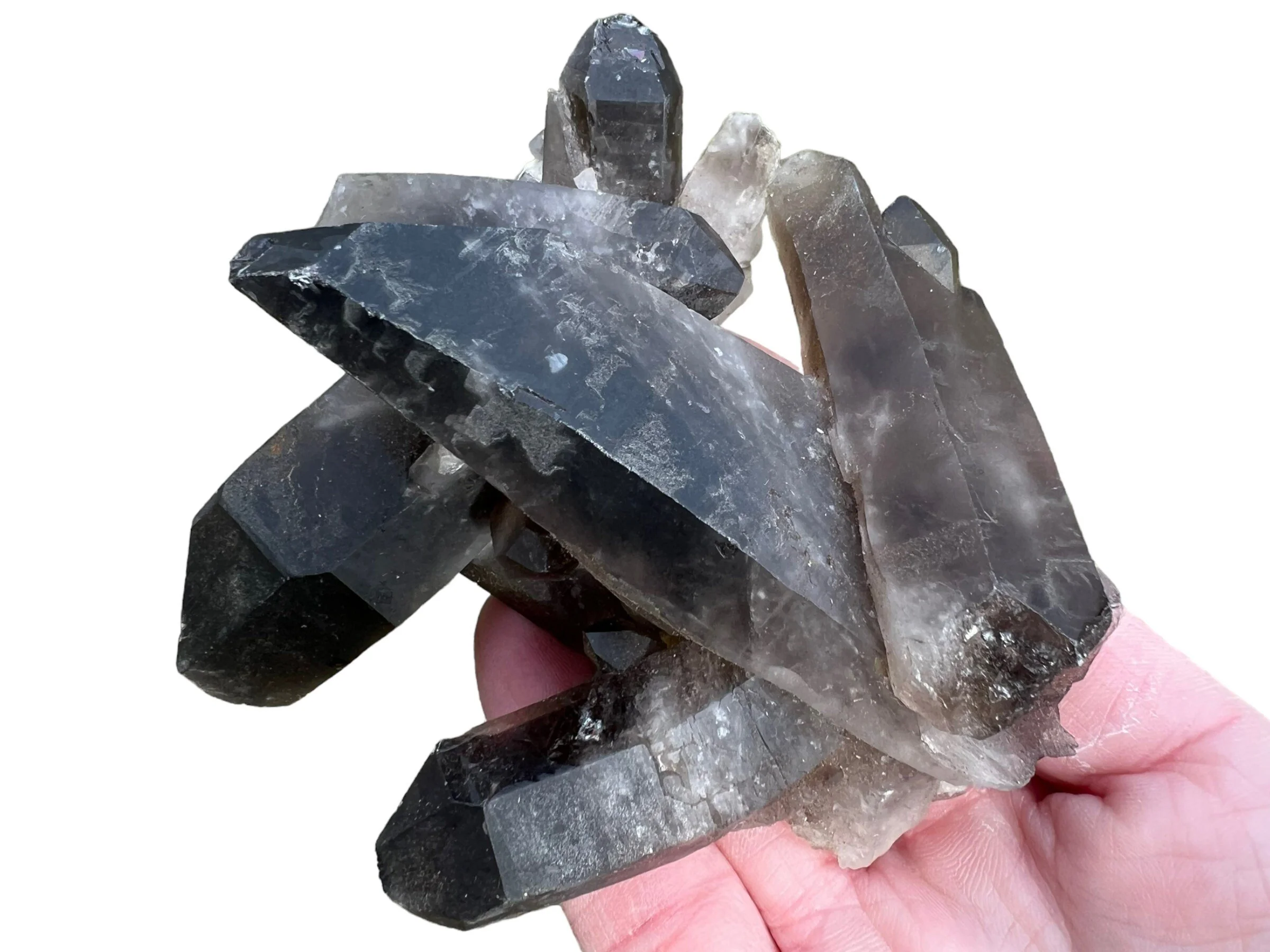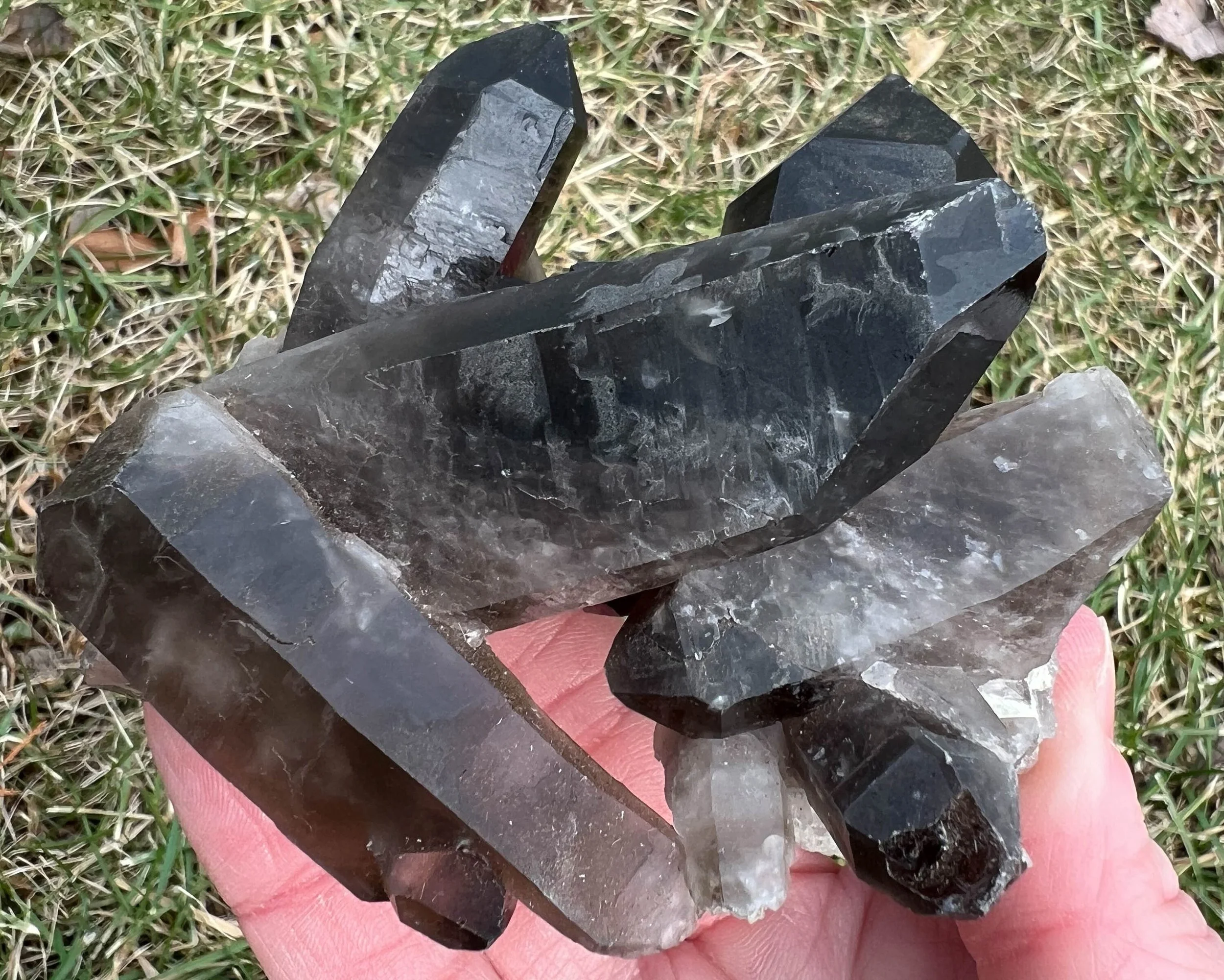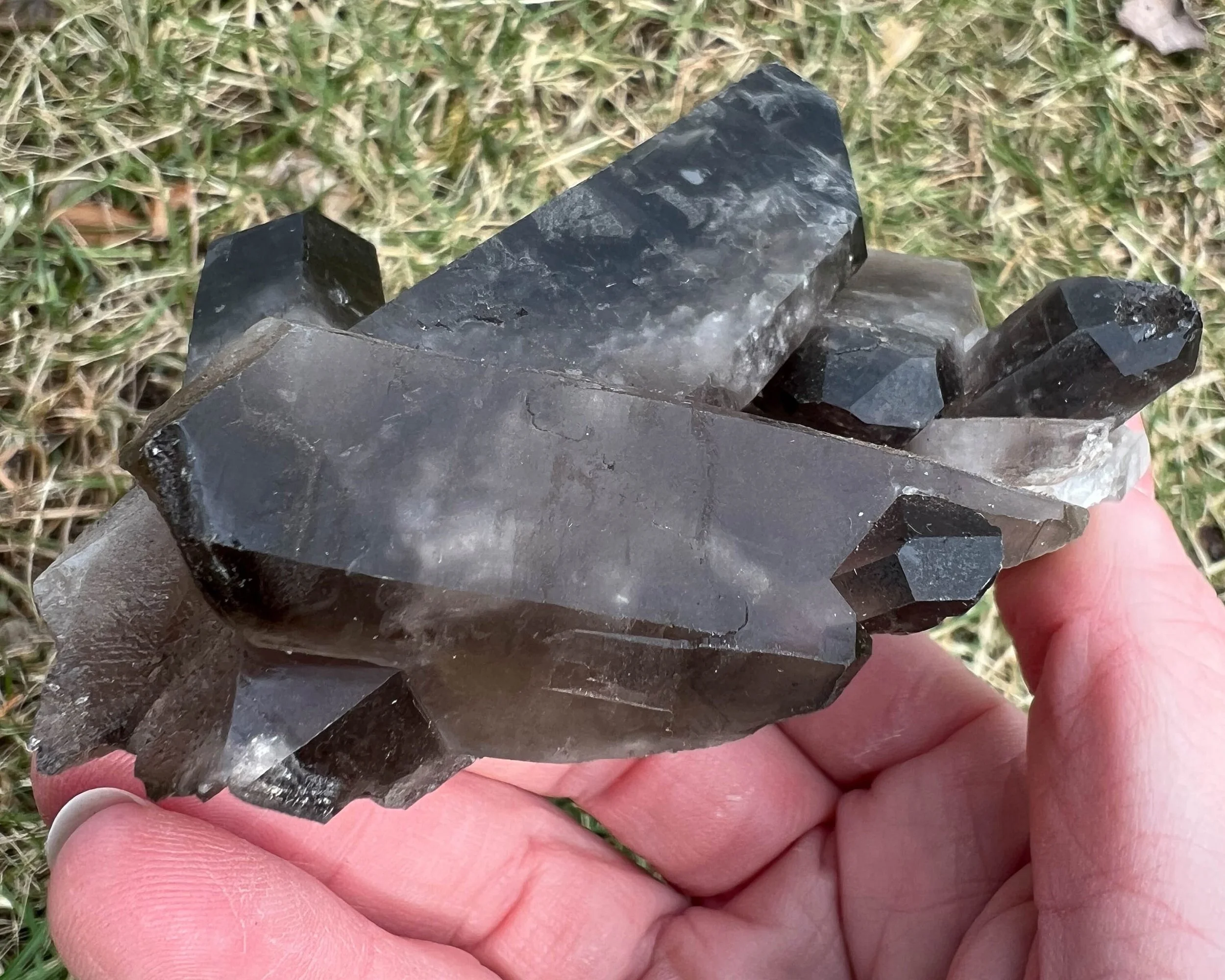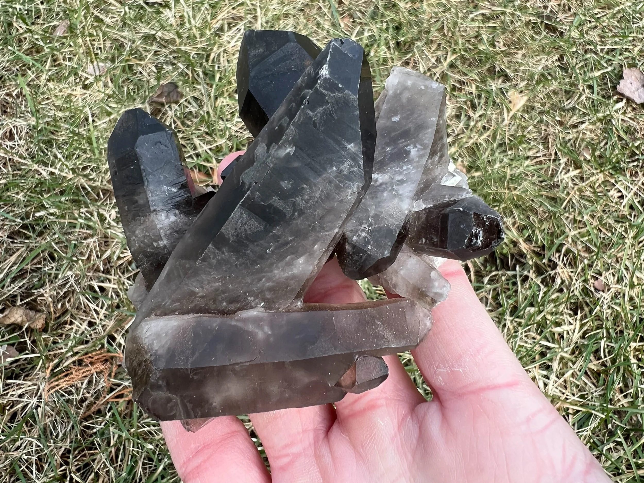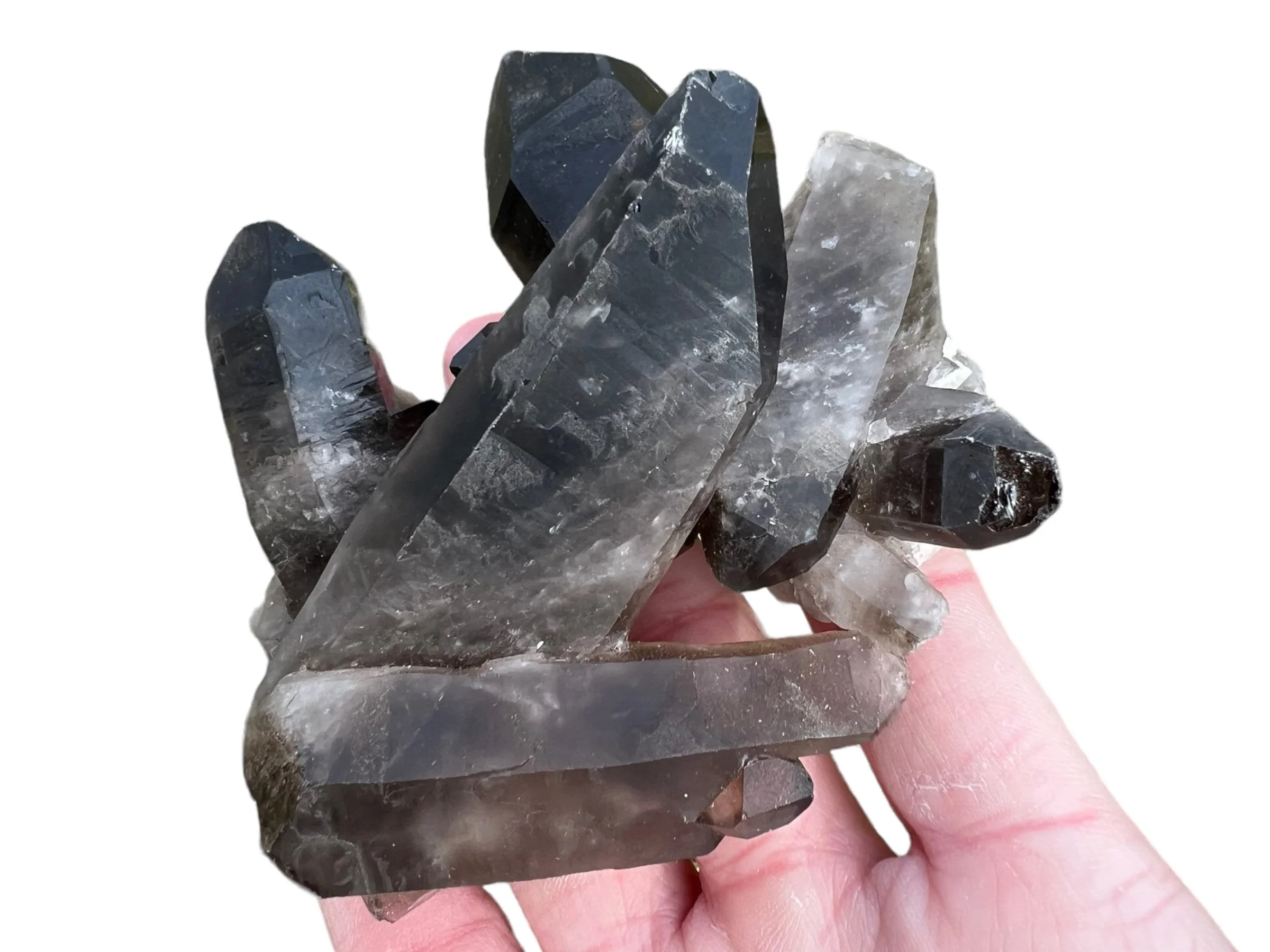 A cluster of beautiful Smoky Quartz crystals with glassy, transparent crystals. A funky and aesthetic cluster. Crystals are dark and have good clarity when held up to light. A beautiful crystal cluster!