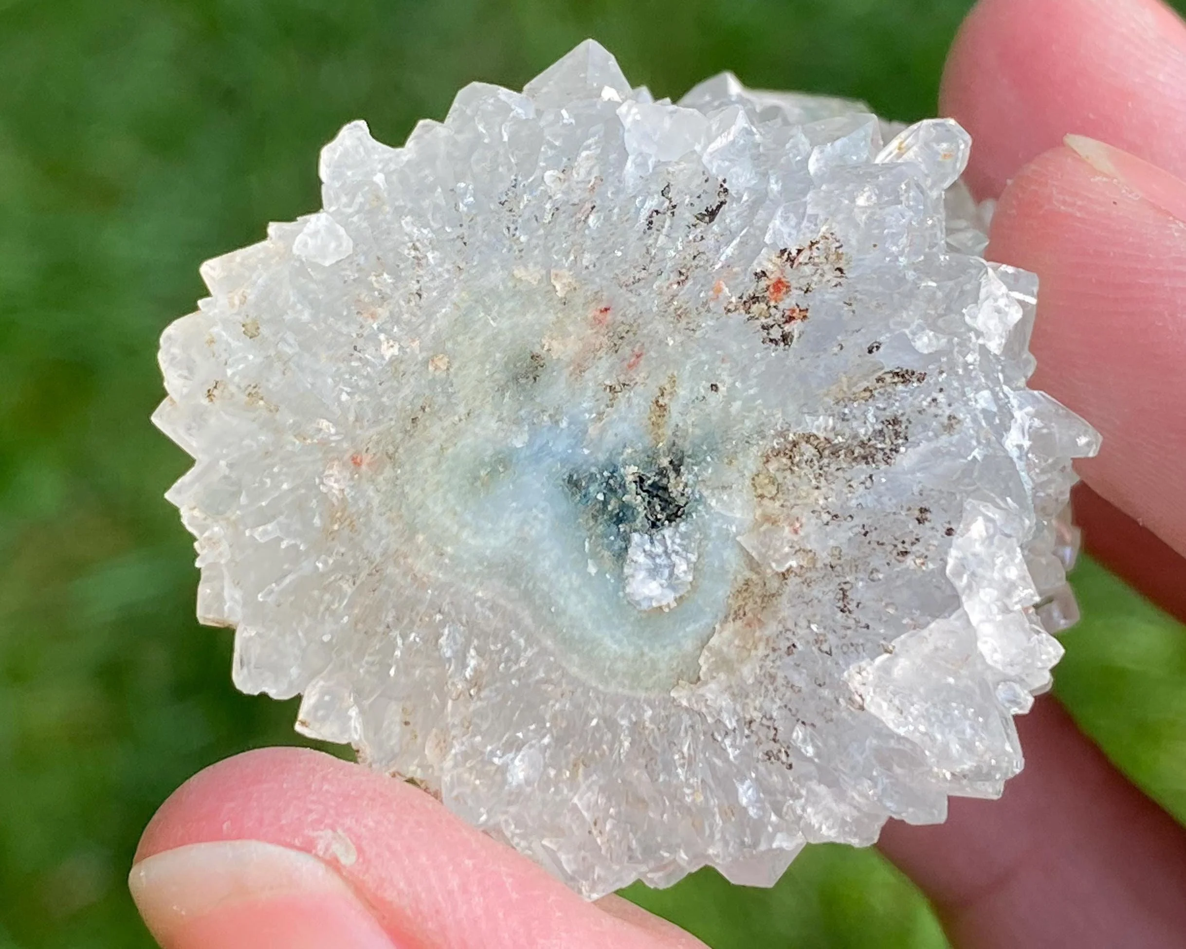 This is a lovely Chalcedony stalactite covered by layers of sparkly Quartz and Apophyllite crystals. It has a funky rosette / flower shape, its really sparkly and it can sit upright nicely for display as well :)