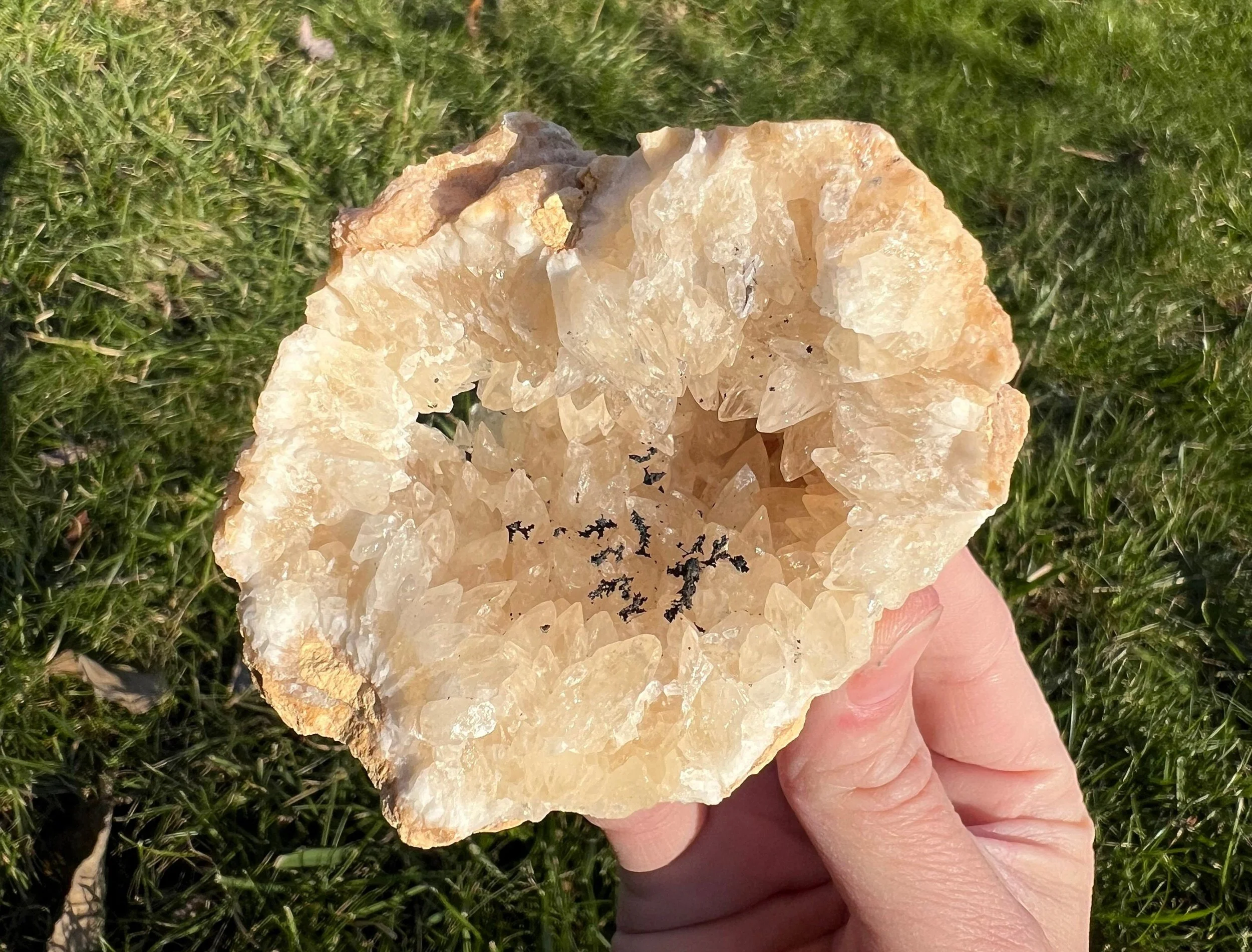 Sparkly Dogtooth Calcite Geode from Morocco. This is a beautiful piece featuring a pocket of lustrous dogtooth Calcite crystals. The crystals are sharp, lustrous and clear and yellow. There are some funky black dendrite-like mineral on some of the geode. A really cool and fun piece :)