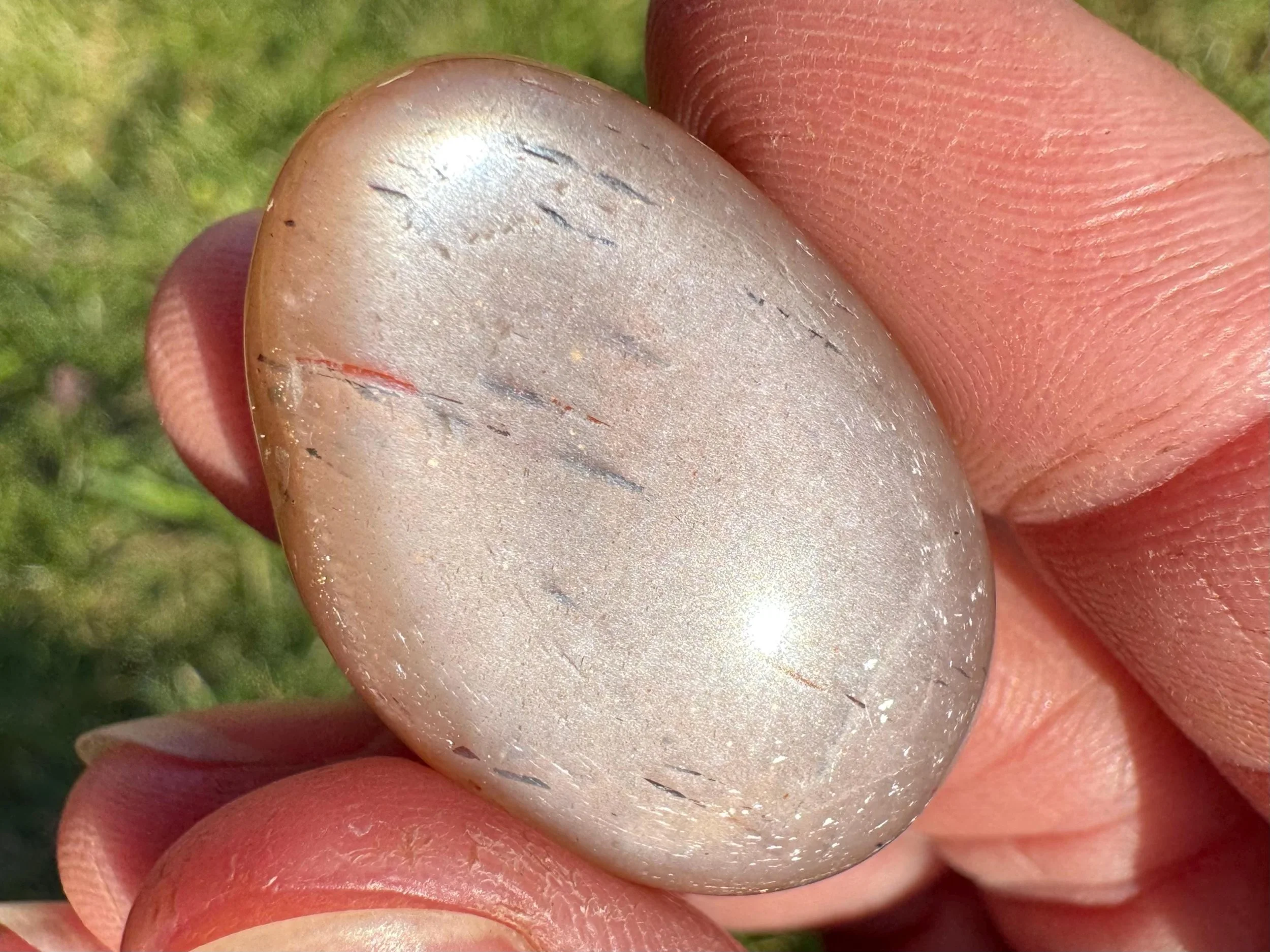 This peach Moonstone palm stone has chatoyant, sparkly "confetti" (Schiller) that shimmers a lot in the light, moving around with it. It is very fun and pretty and wonderful.It also has a nice sheen or flash when held at another angle! It also has red and black streaks. of Hematite that make it extra unique looking. Great for pocket, purse or shelf, nightstand, coffee table or anywhere else. Any crystal lover will appreciate the beauty in this stone.