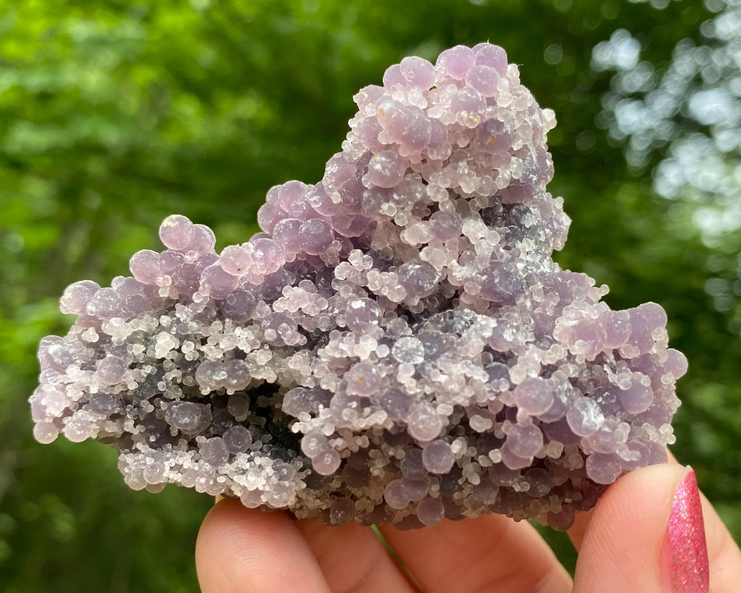 This is a beautiful piece of sparkly "Grape Agate," also known as purple Botryoidal Chalcedony with Druzy Quartz. It comes from Indonesia and is not enhanced or dyed. It has a shiny, velvety look to it. These are super cute, bubbly fun little crystals that are quite lovable! :D