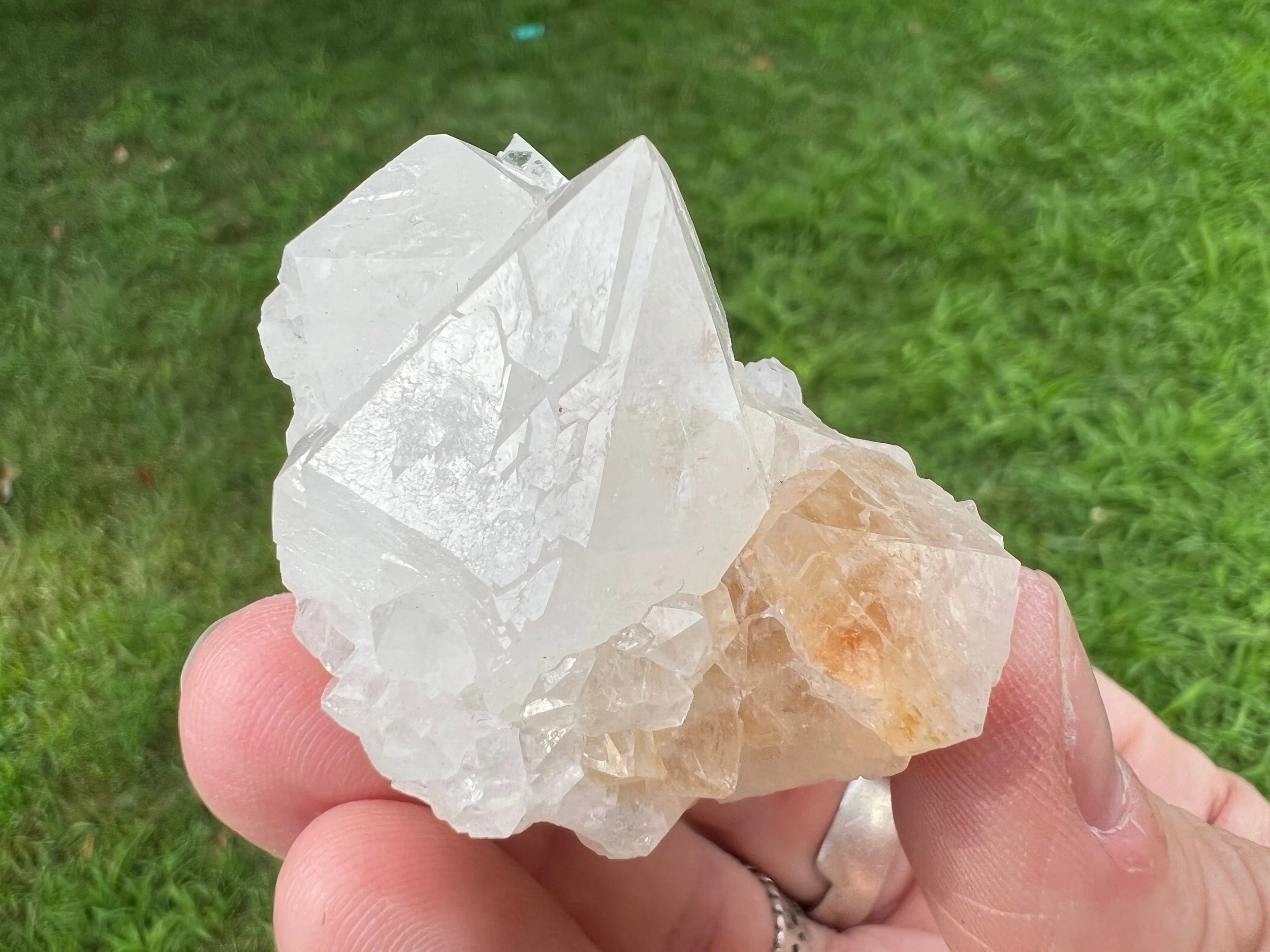 This is a small Spirit Quartz cluster, its sparkly and awesome! Spirit Quartz are a two stage Quartz with main crystal points that have a secondary growth of smaller crystals that have formed along their sides, the secondary crystals can be tiny glittering druzy or big chunky points. They are exclusively from South Africa.