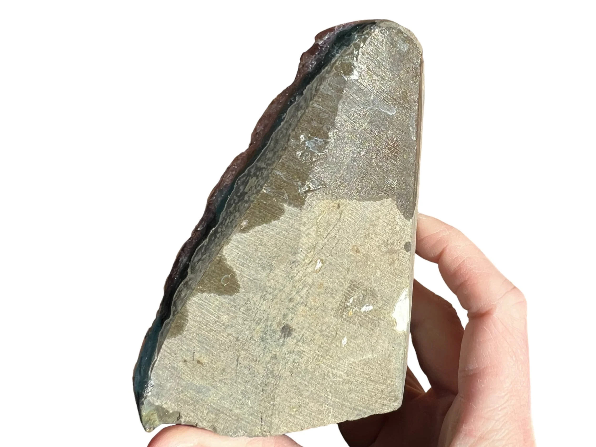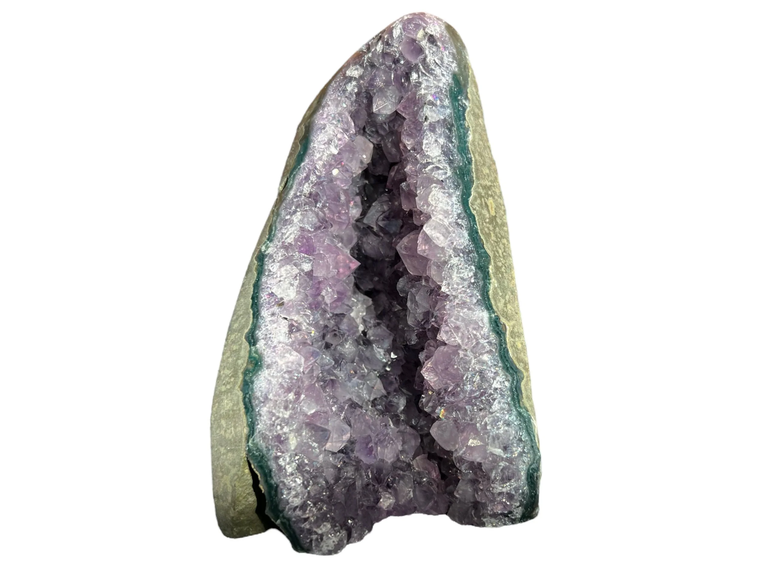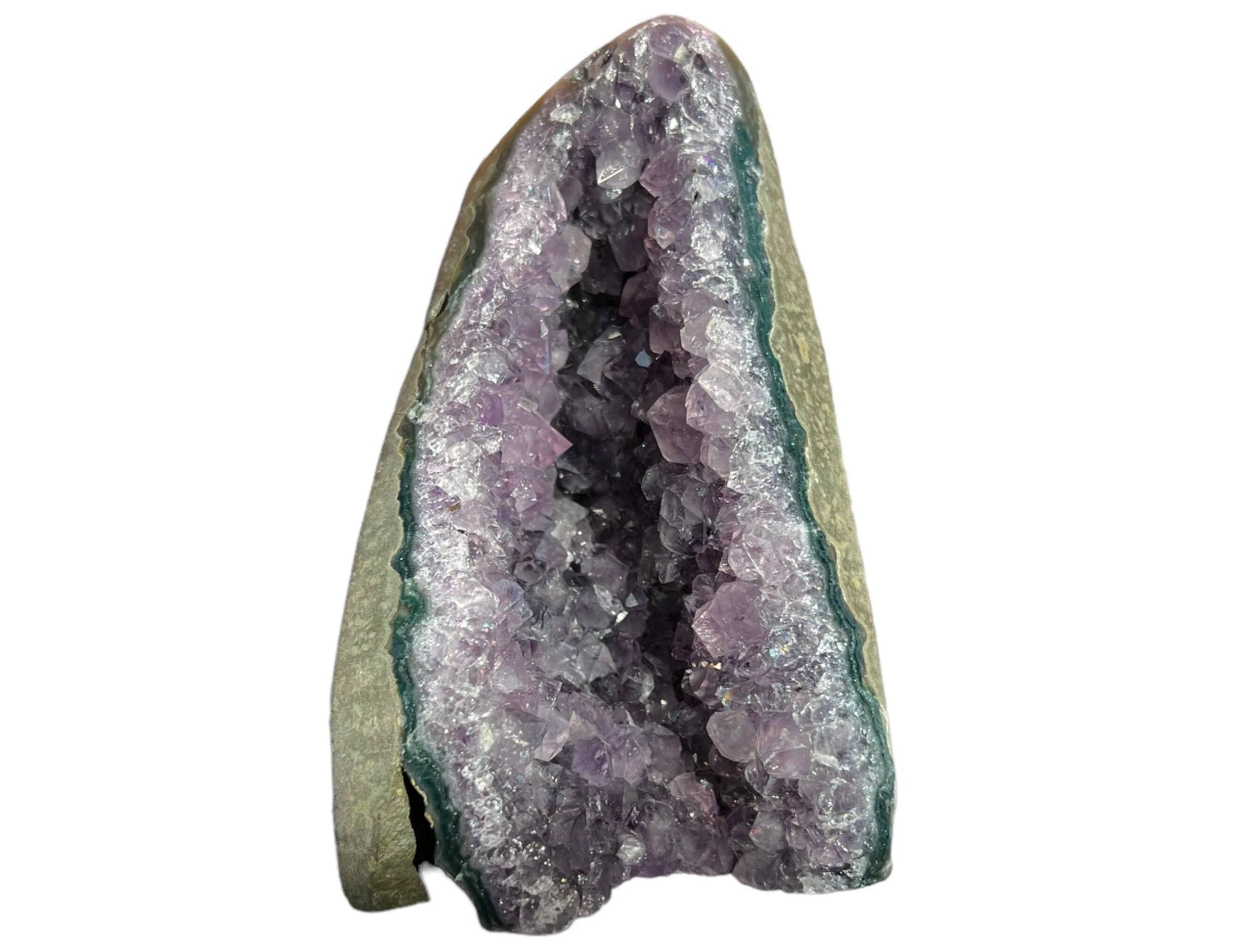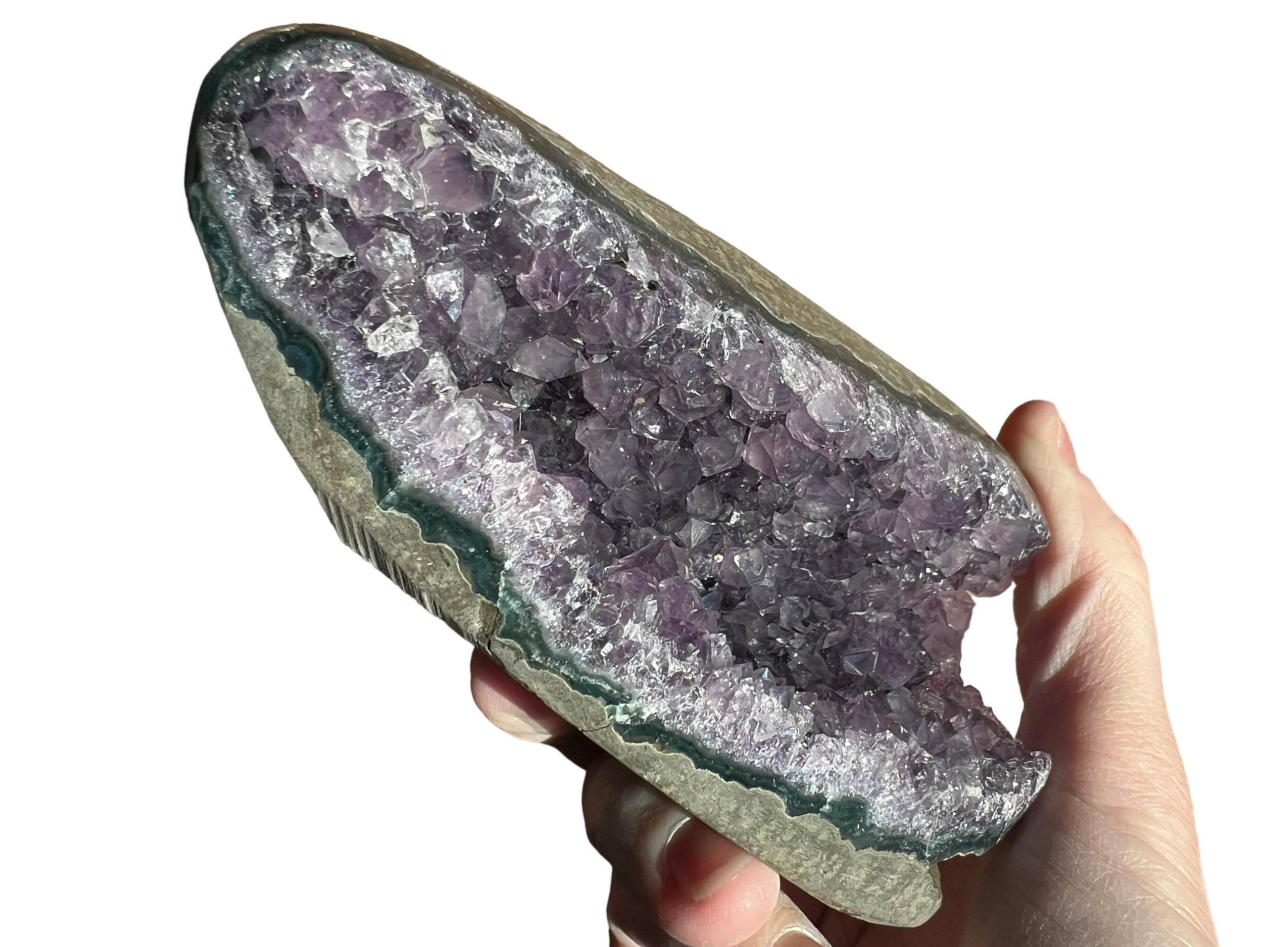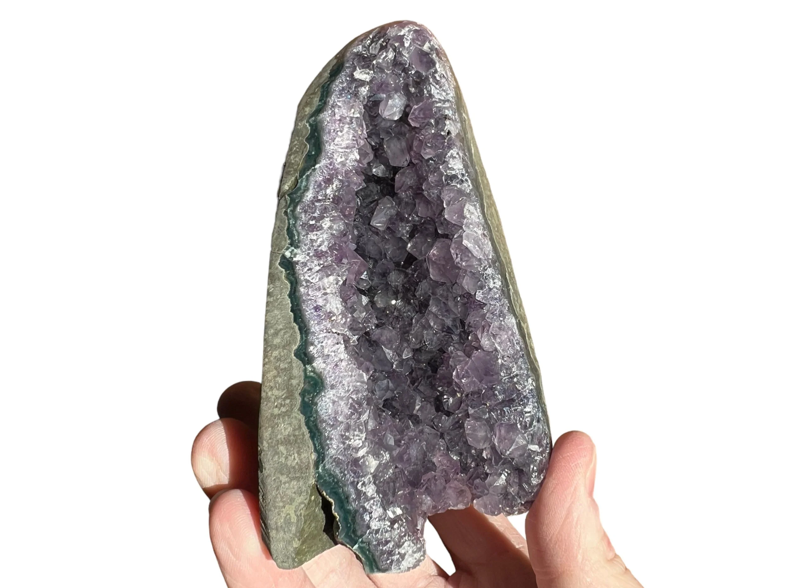 This is small Amethyst geode with a flat bottom so that it is self standing, it is small sized, perfect for desktop or nightstand or anywhere you want a little Amethyst cathedral. Full of glassy, purple Amethyst druzy crystals. Very pretty.