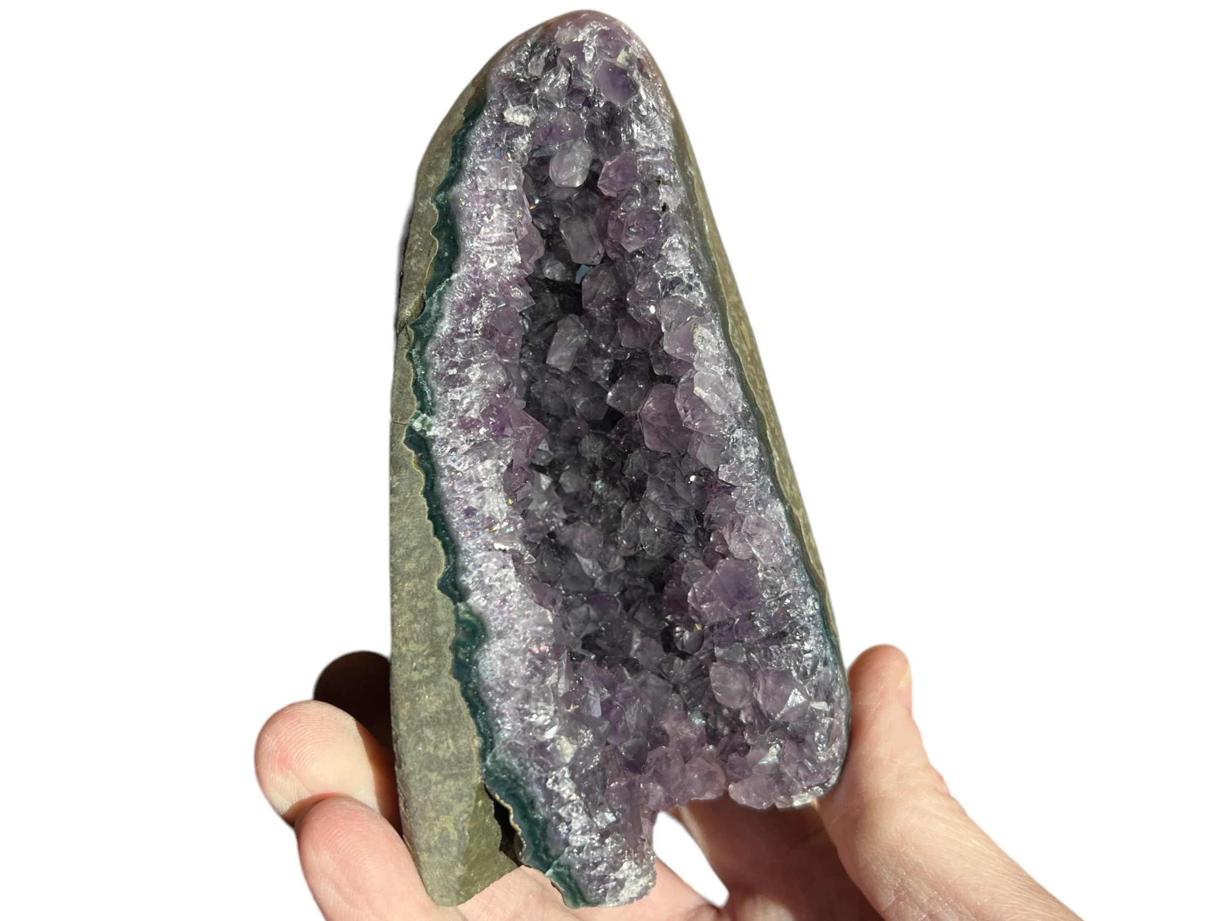 This is small Amethyst geode with a flat bottom so that it is self standing, it is small sized, perfect for desktop or nightstand or anywhere you want a little Amethyst cathedral. Full of glassy, purple Amethyst druzy crystals. Very pretty.