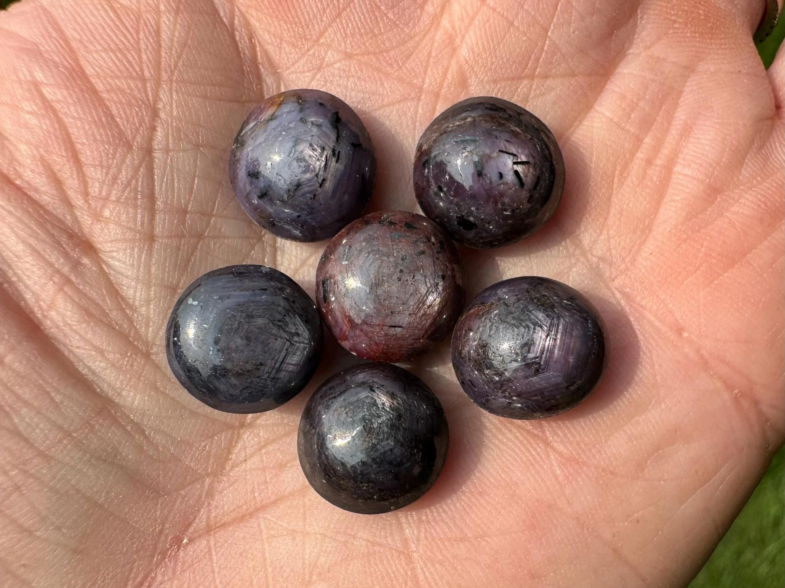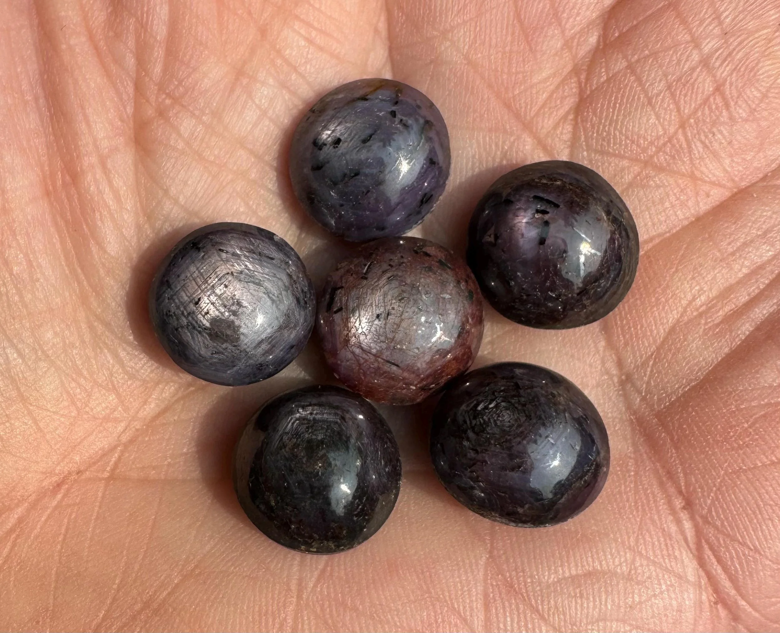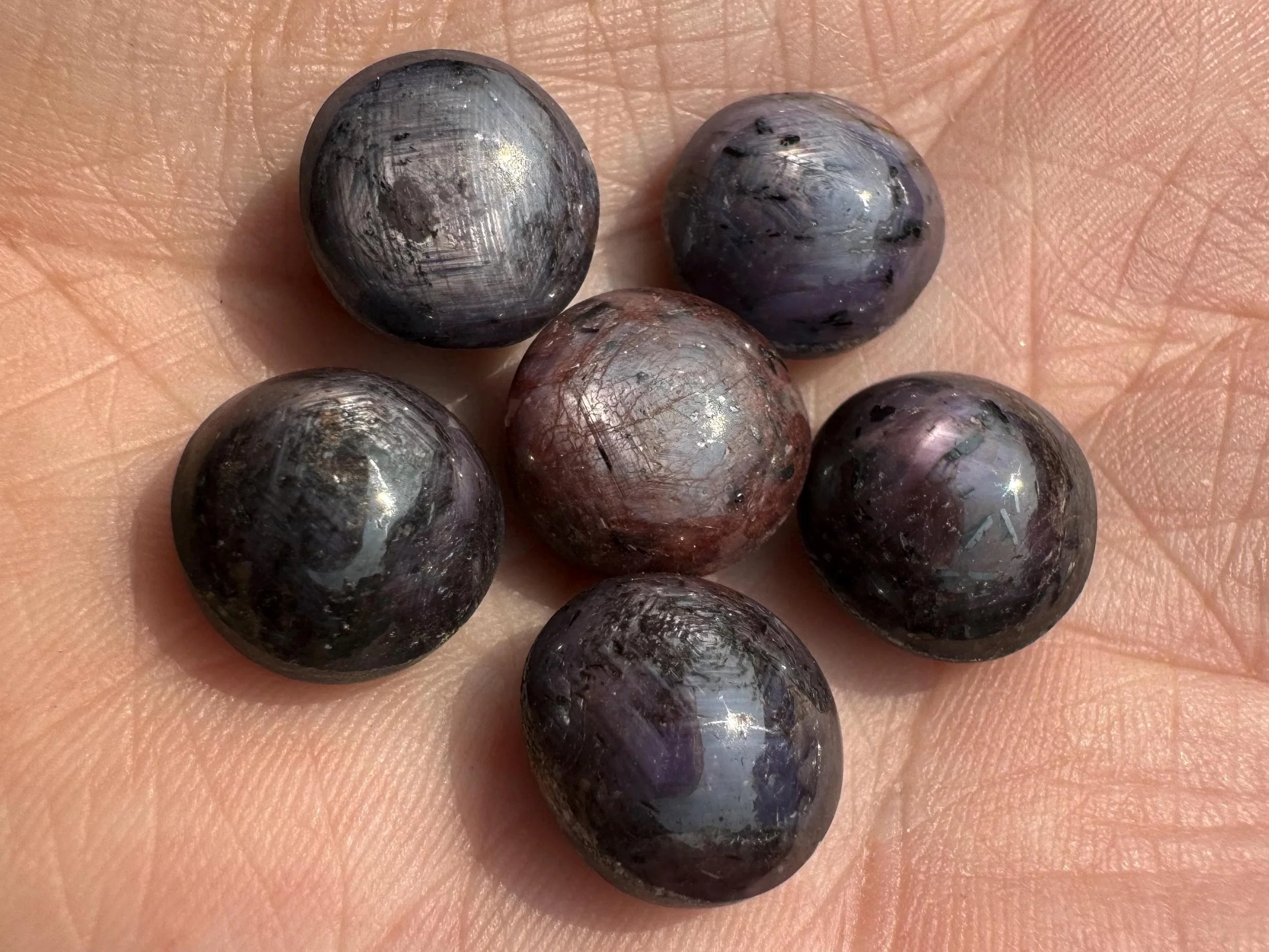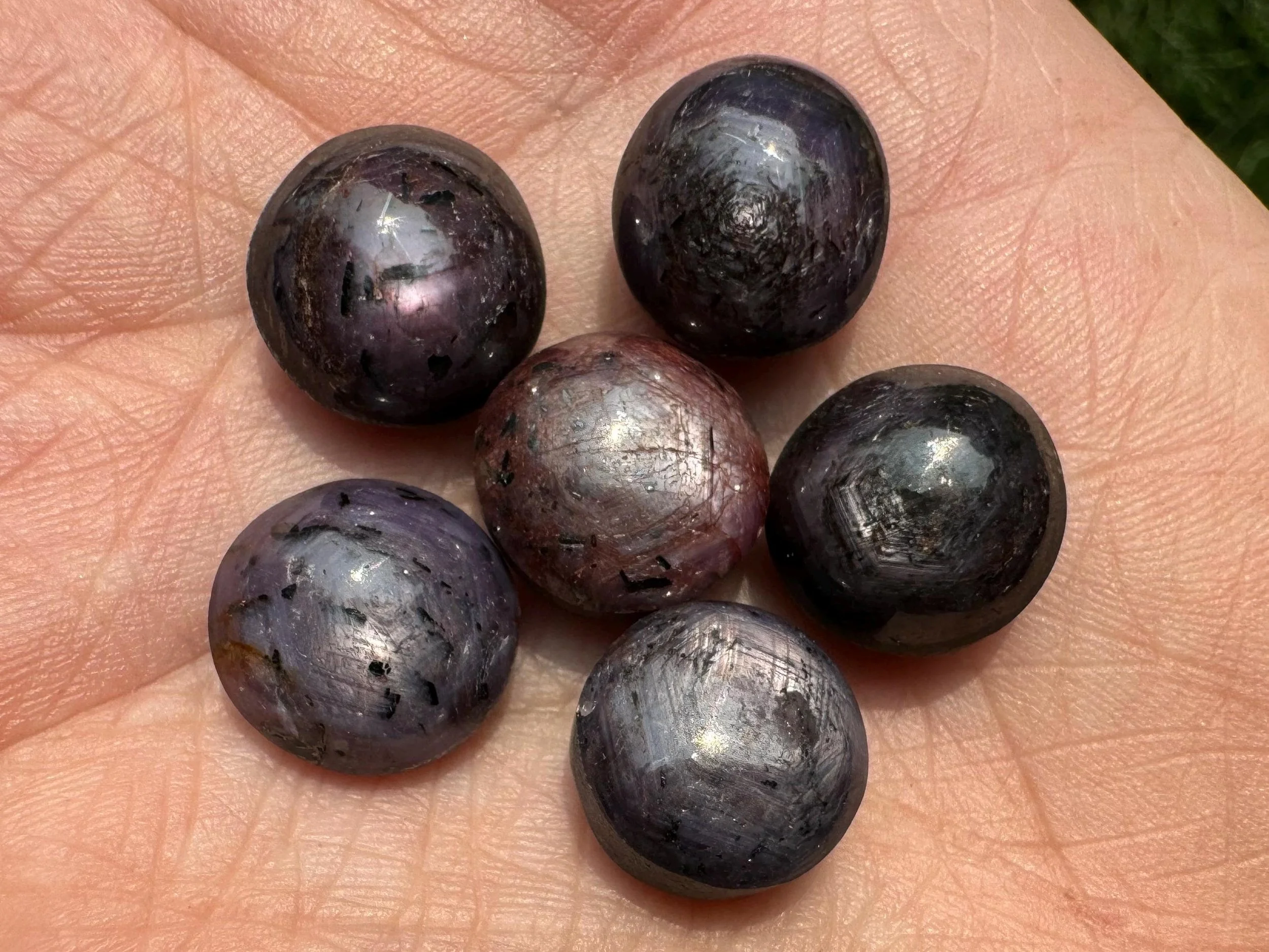 This is a lot, bundle or set of six small round Star Ruby Cabochons with beautiful chatoyance or sheen, and lovely star lines that move with the light. They have pretty pink, red and purple coloring, lots of light, nicely polished on top with a flat bottom/ back
