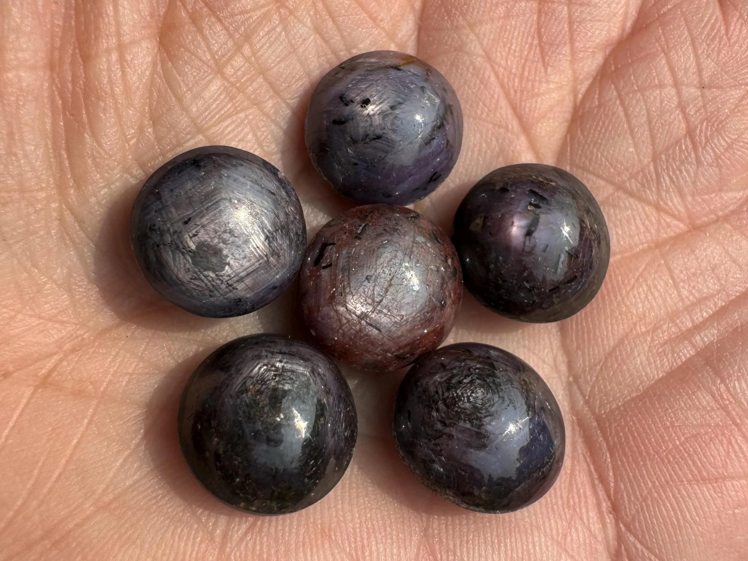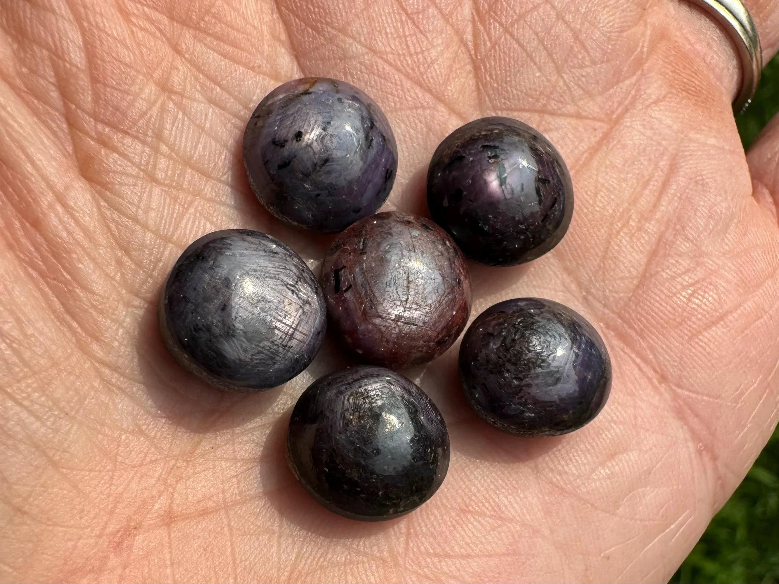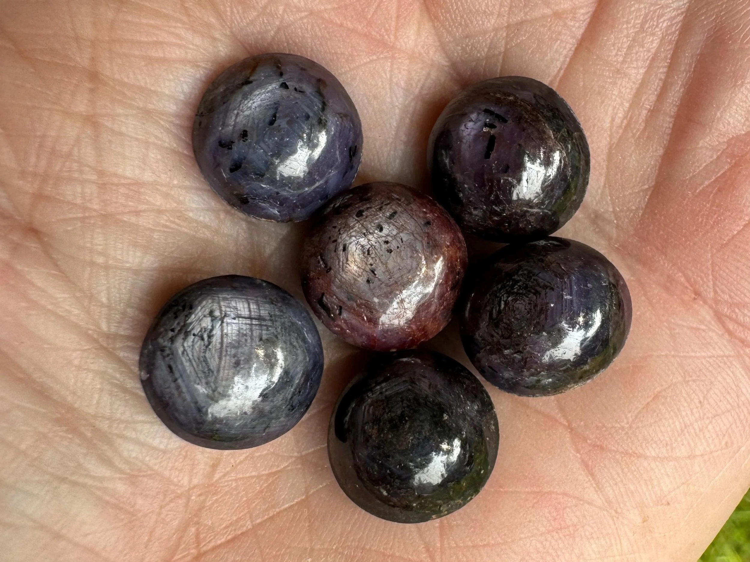 This is a lot, bundle or set of six small round Star Ruby Cabochons with beautiful chatoyance or sheen, and lovely star lines that move with the light. They have pretty pink, red and purple coloring, lots of light, nicely polished on top with a flat bottom/ back