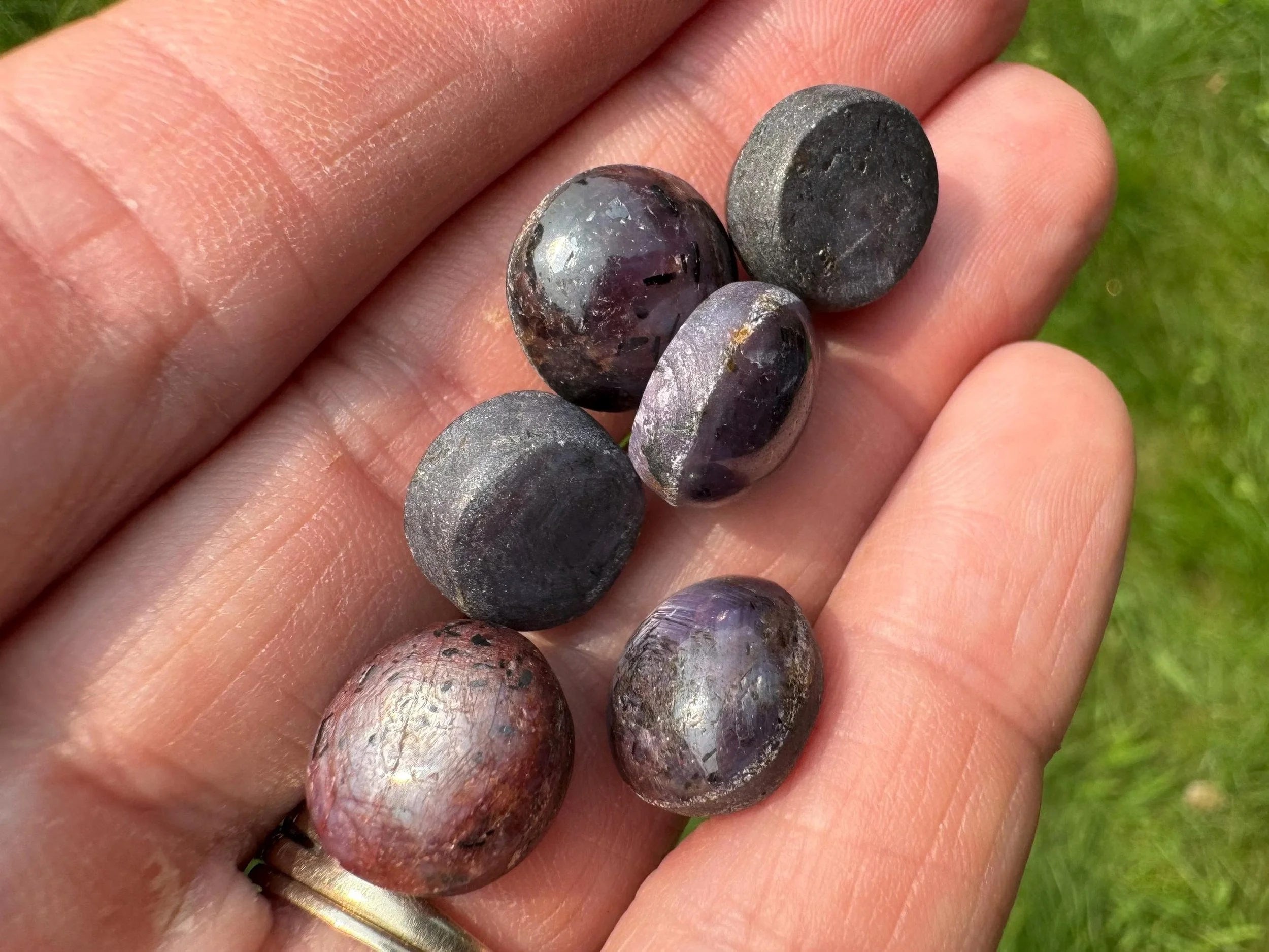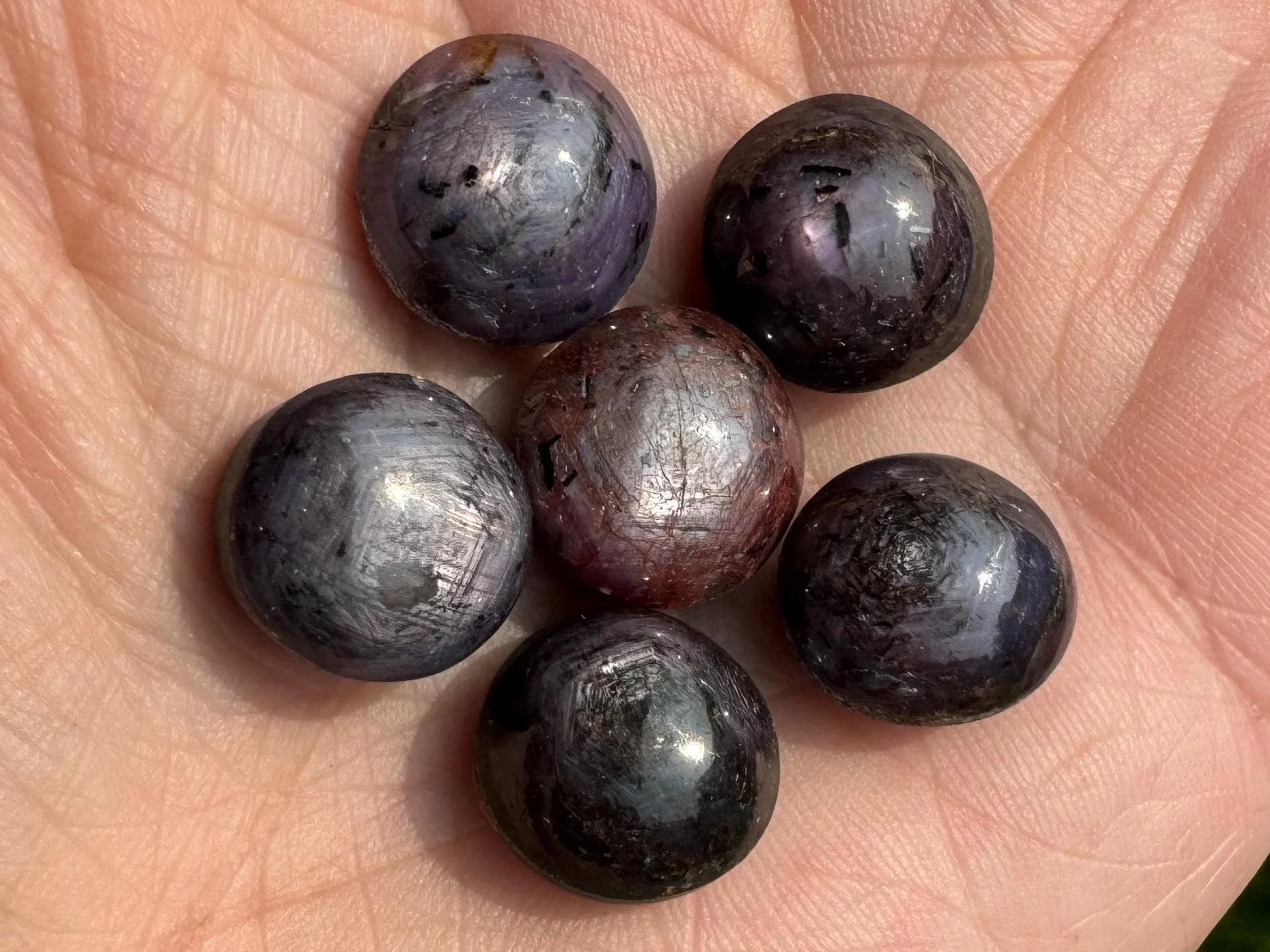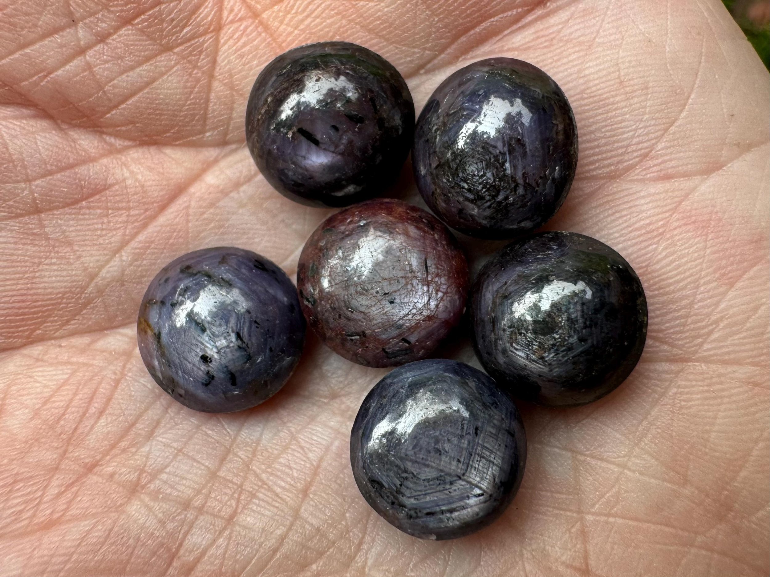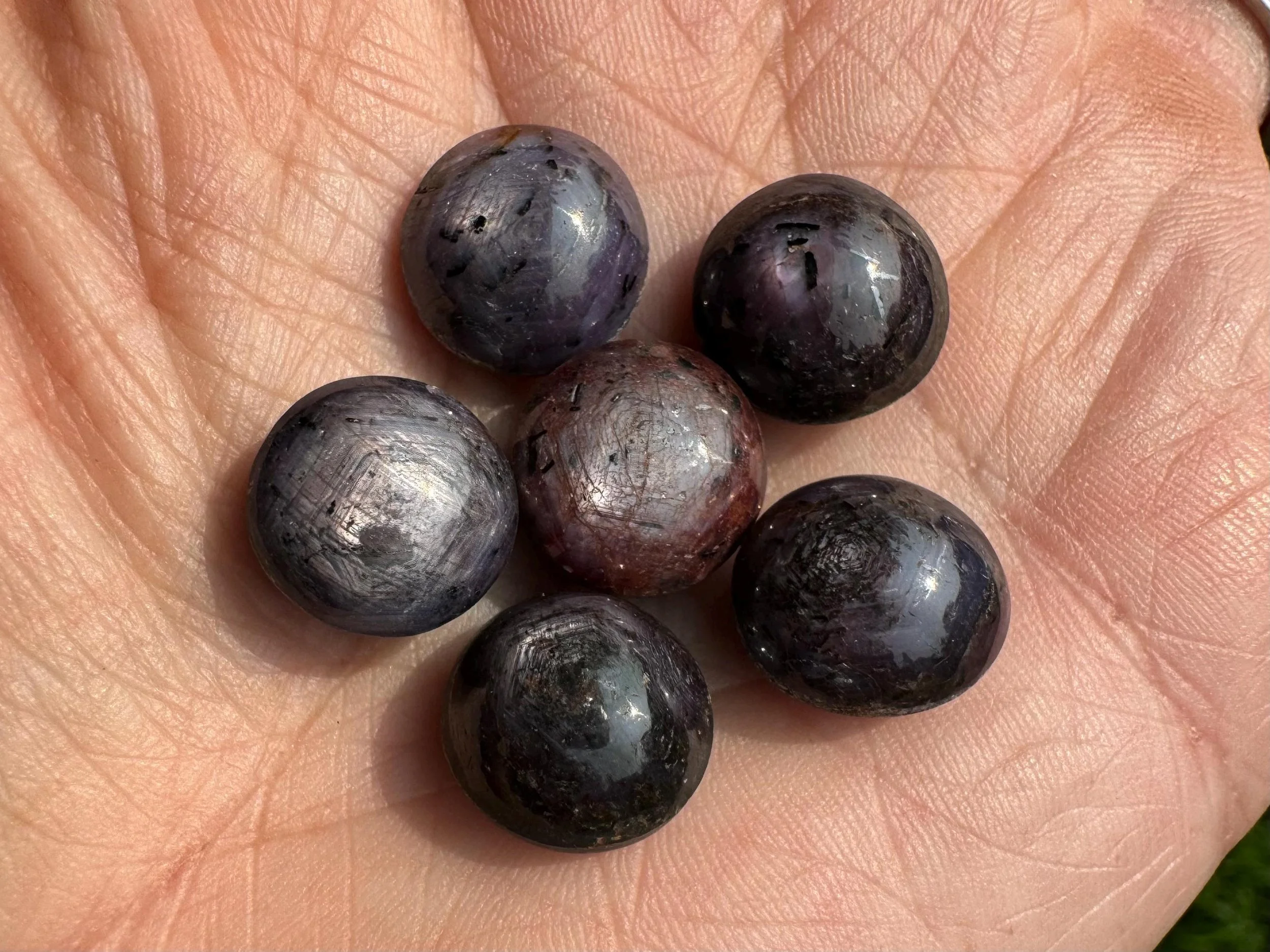 This is a lot, bundle or set of six small round Star Ruby Cabochons with beautiful chatoyance or sheen, and lovely star lines that move with the light. They have pretty pink, red and purple coloring, lots of light, nicely polished on top with a flat bottom/ back