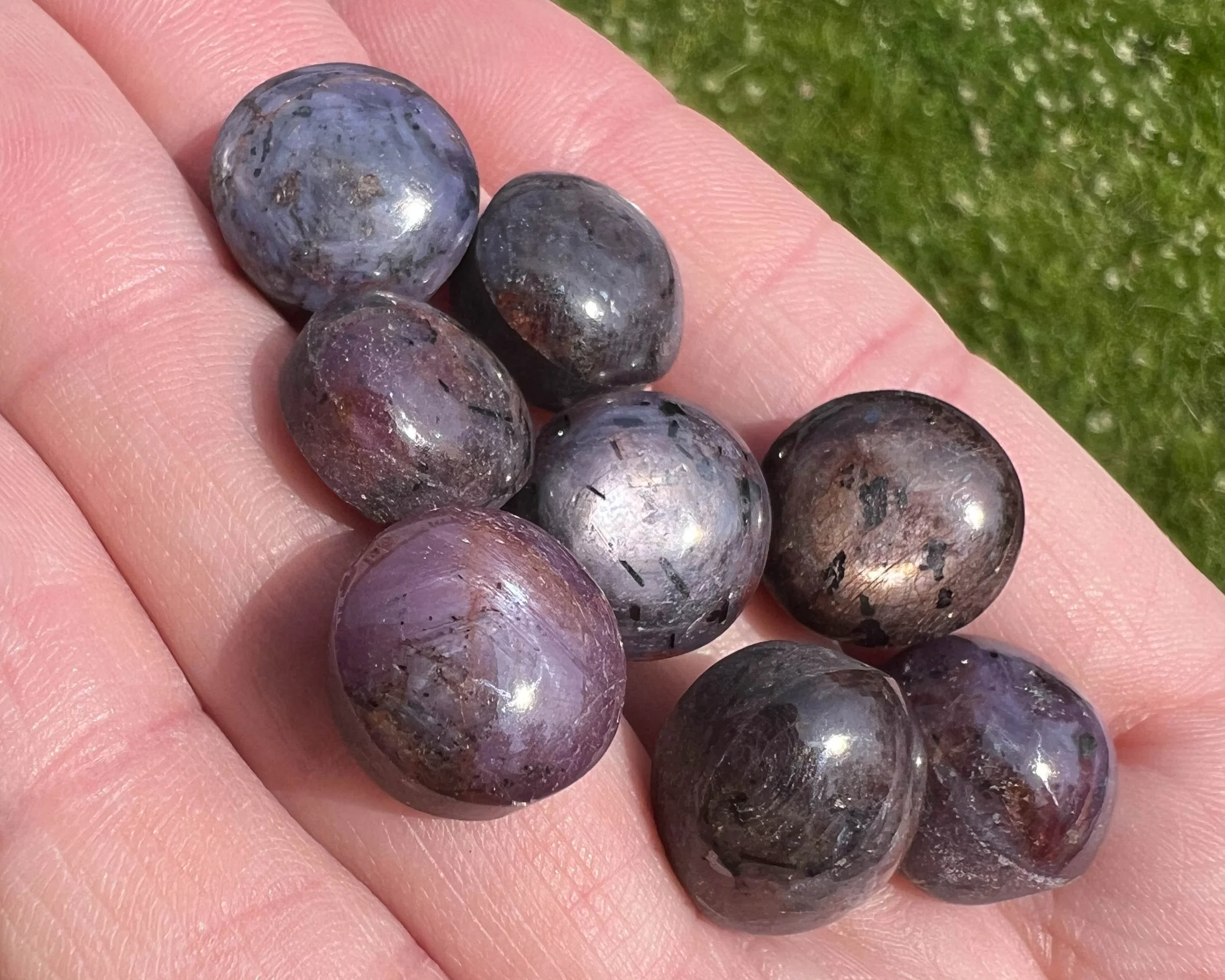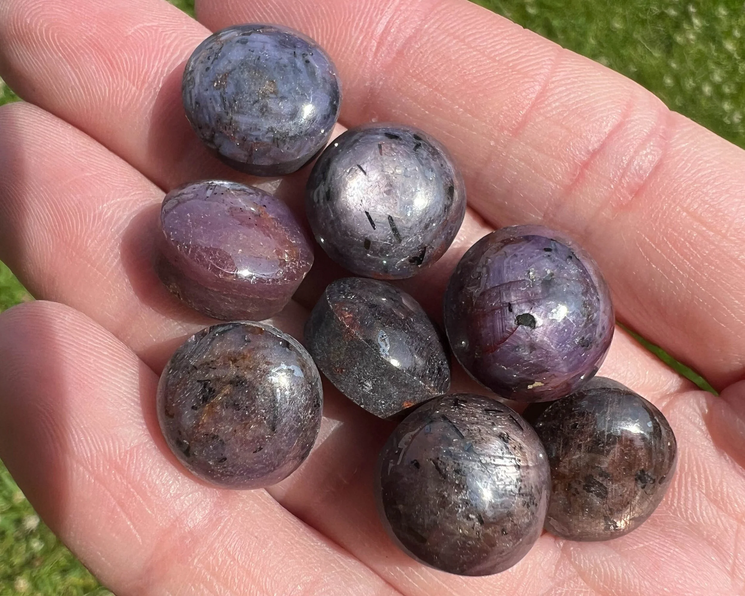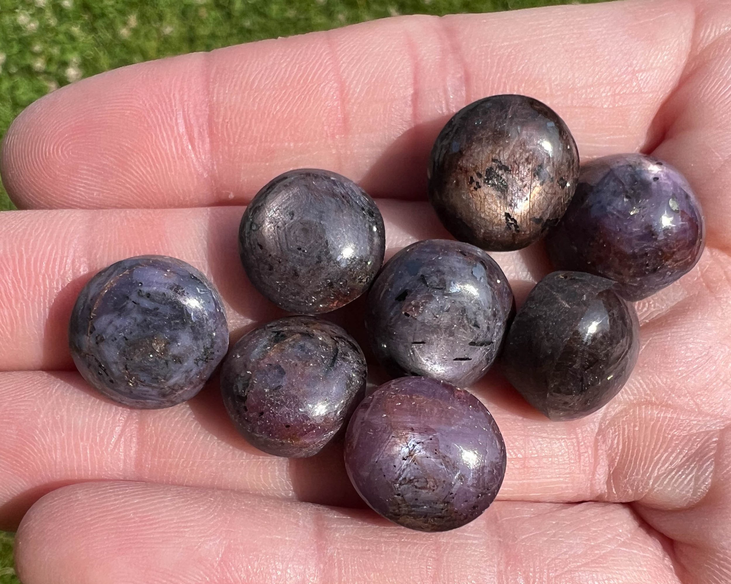 This is a lot / bundle / set of 8 small round Star Ruby Cabochons with beautiful chatoyance or sheen, and lovely star lines that move with the light. They have beautiful pink, red and purple coloring, lots of light, nicely polished on top with a flat bottom/ back
