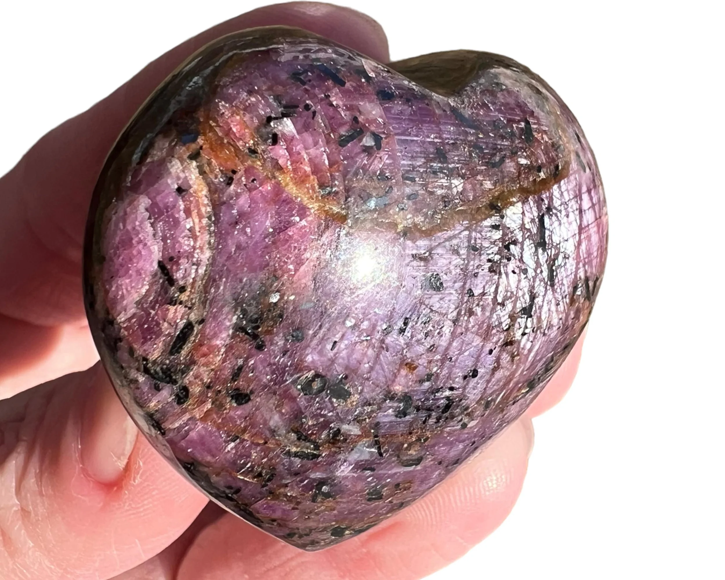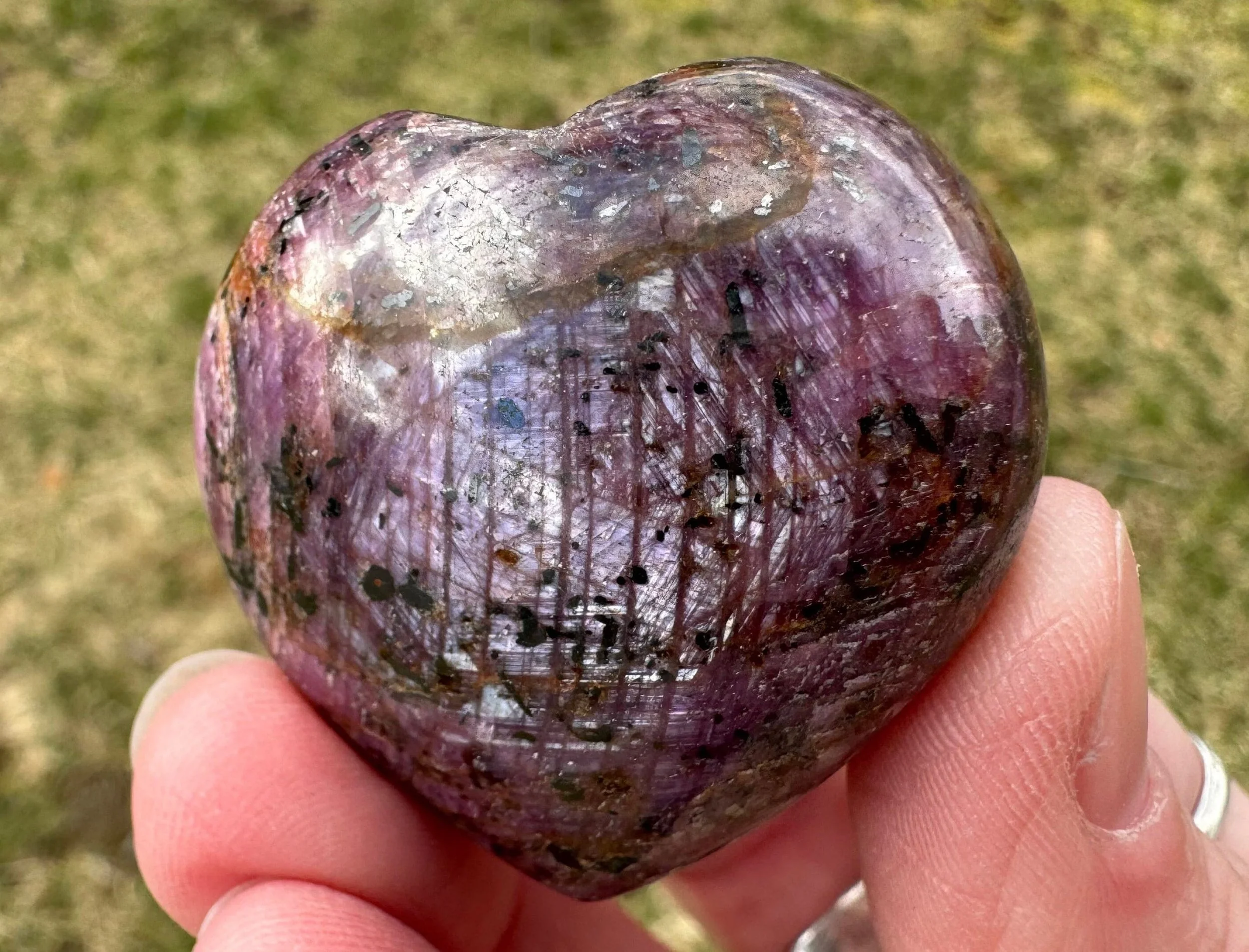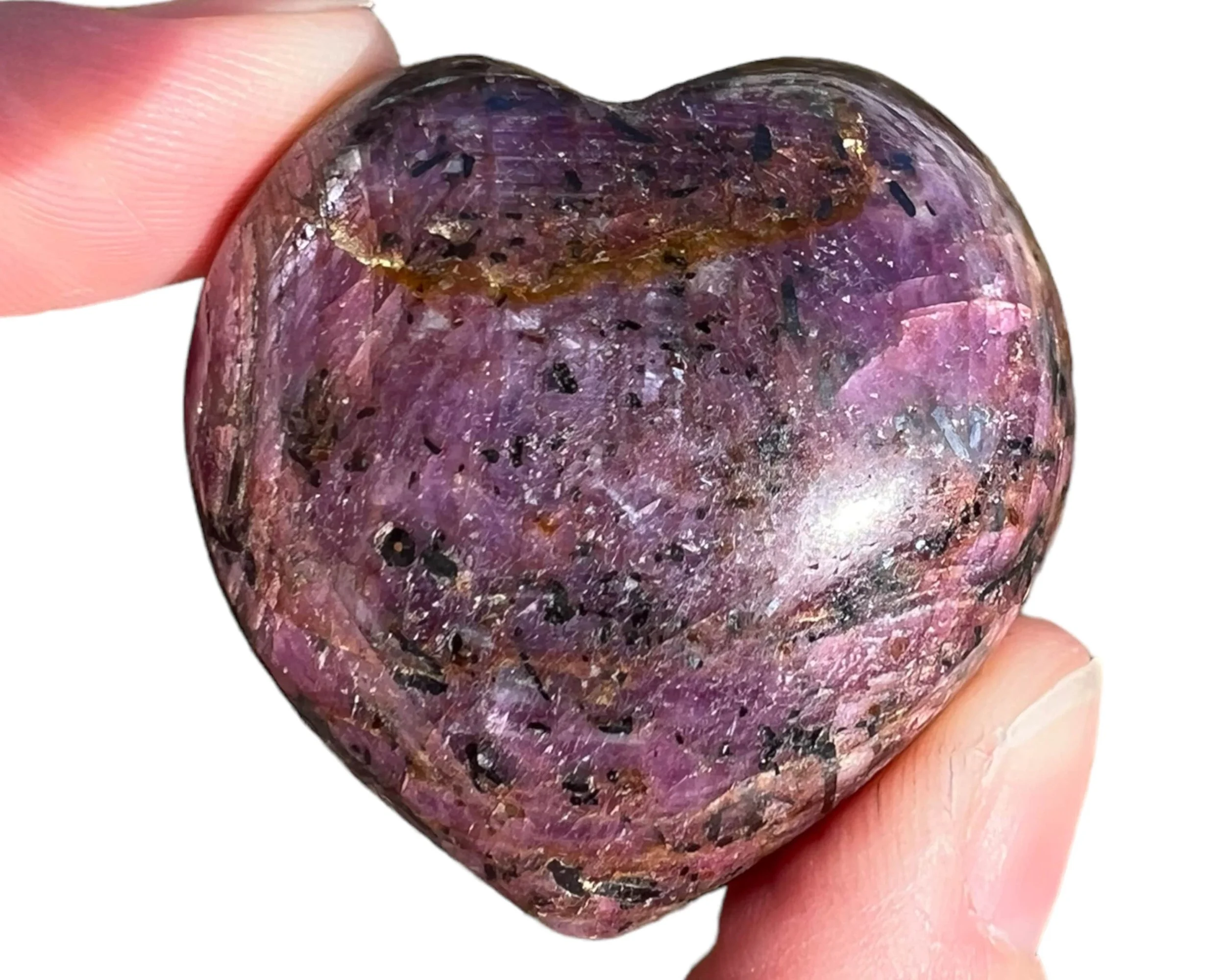 This is a Star Ruby heart with beautiful chatoyance on both sides and lovely star lines that move with the light (called asterism) and the sheen shows the ruby’s hexagon shape within.