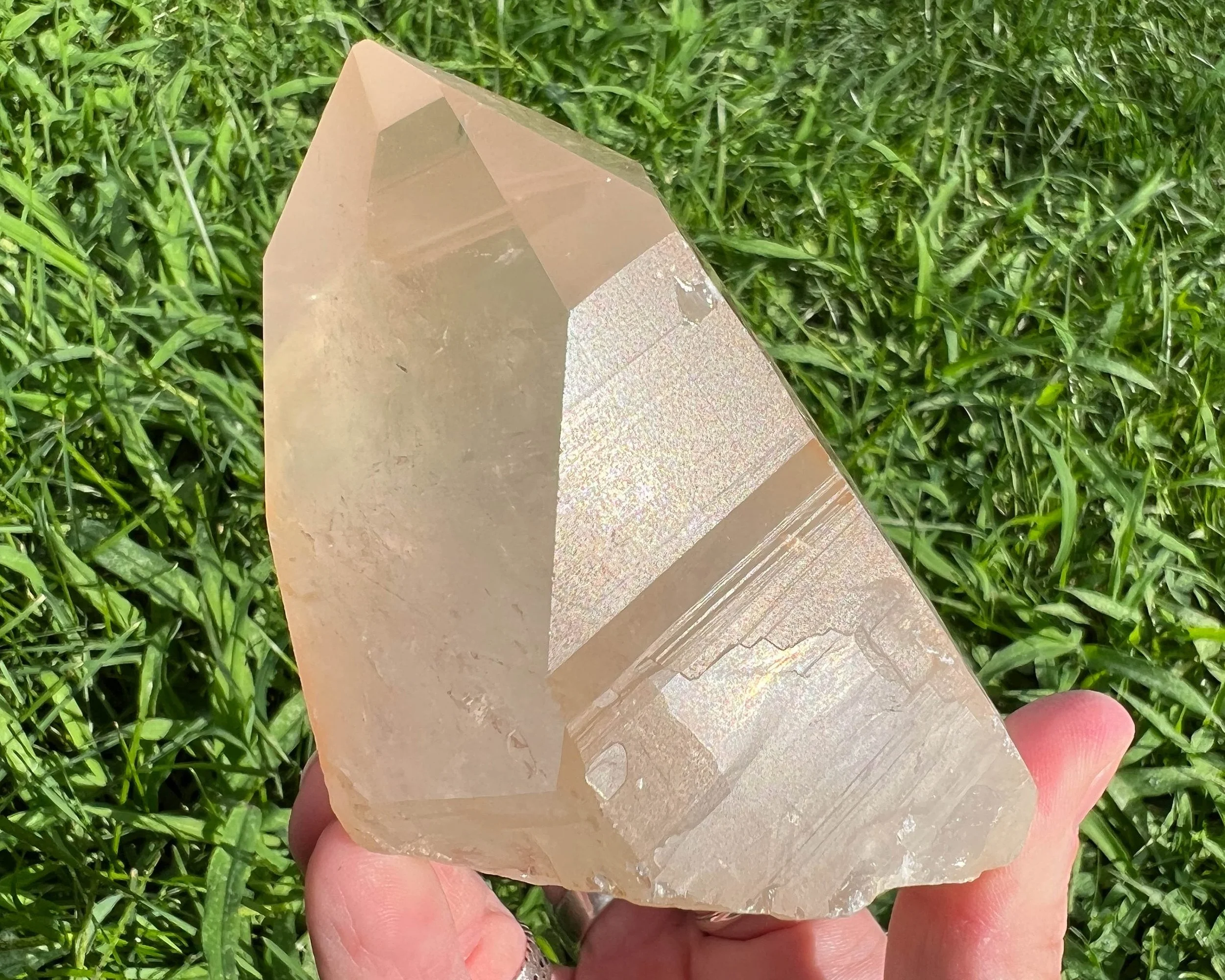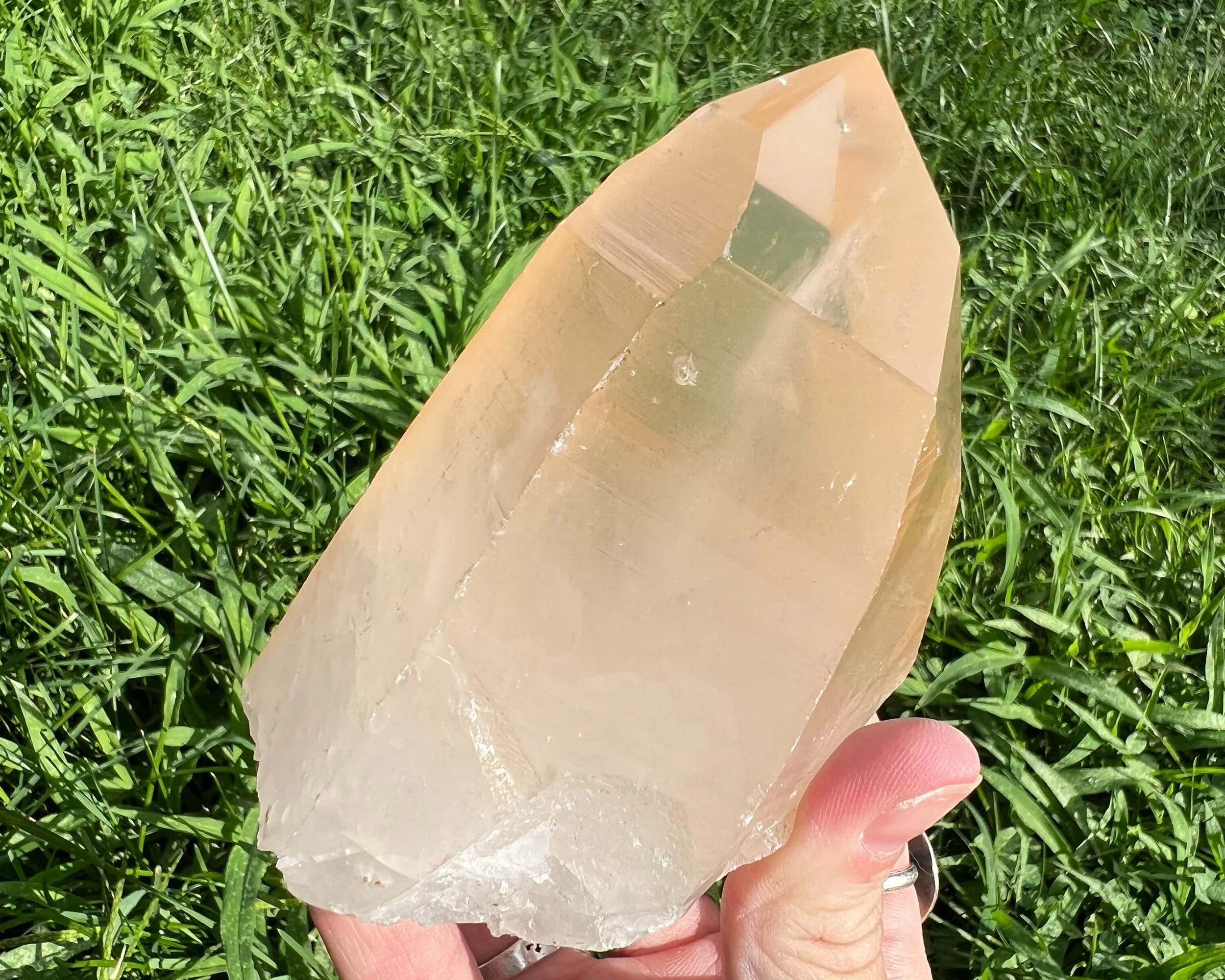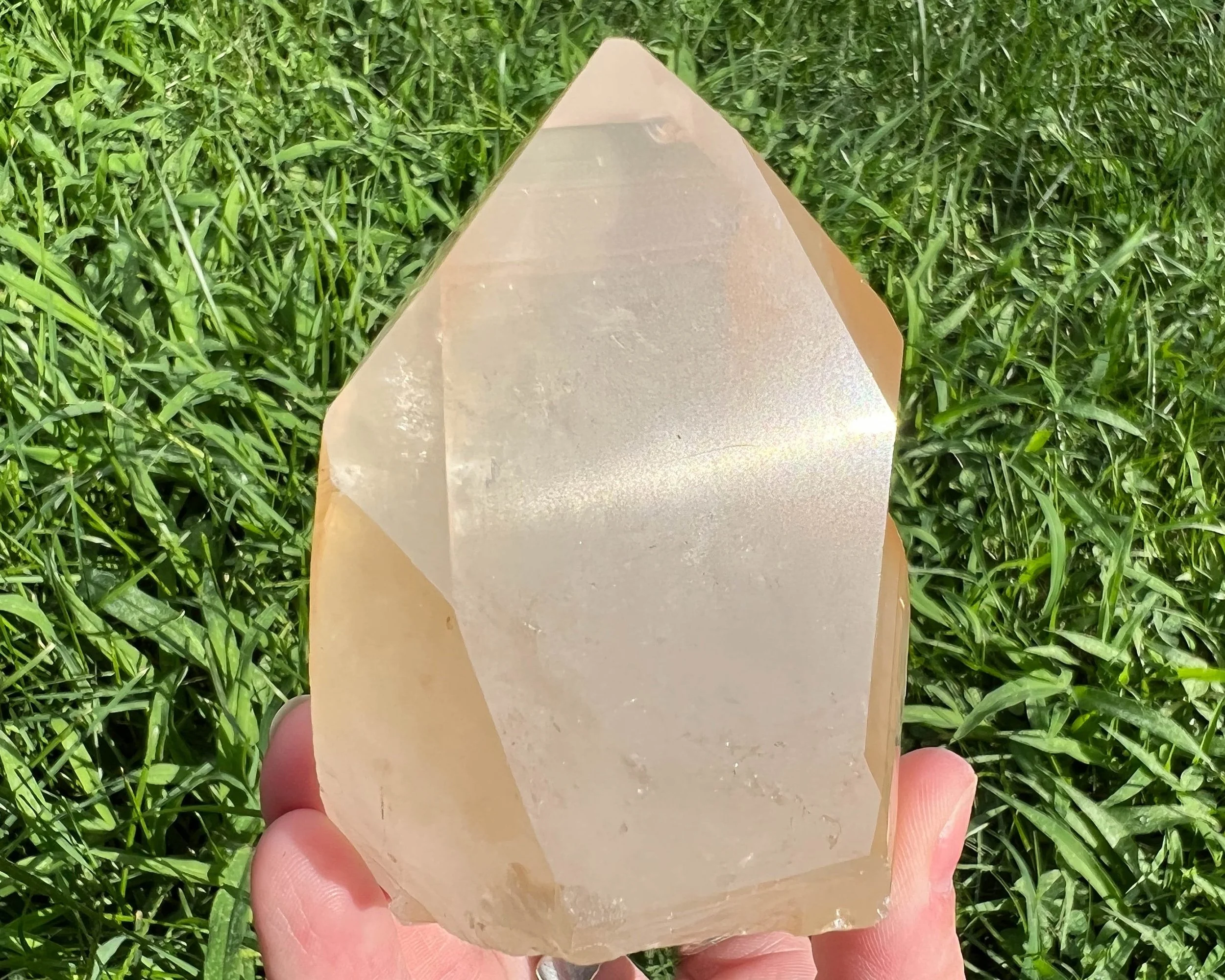 Tangerine Quartz points are natural Quartz crystals that have orange Hematite on or in them, giving them a lovely Tangerine color. They are fun and colorful.