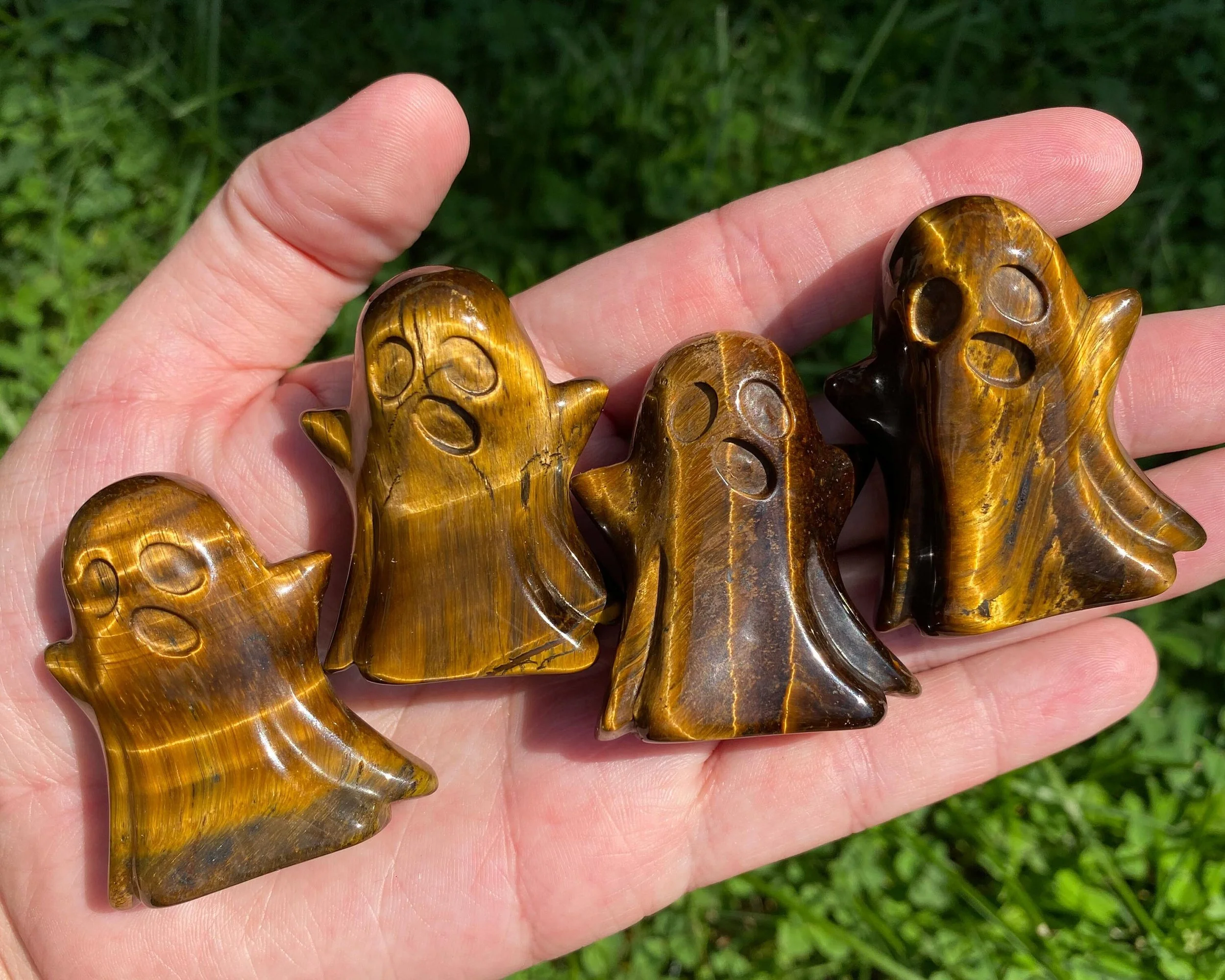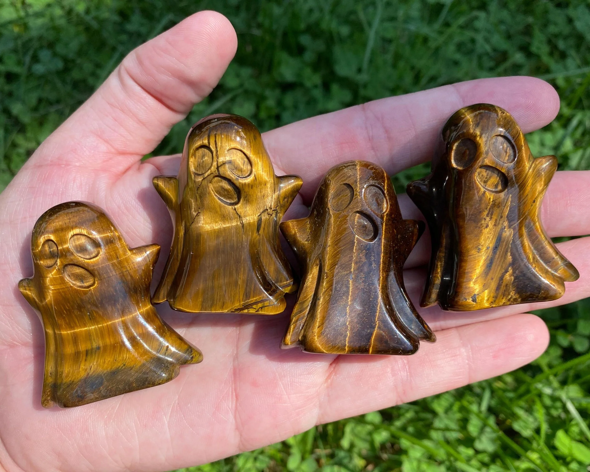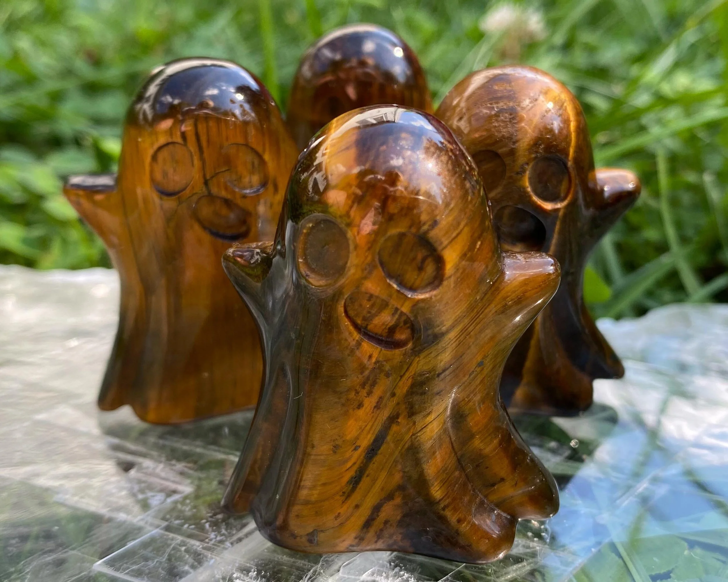 These are cute spooky little ghosts carved from chatoyant Tigers eye. It adds a wonderful touch of Halloween spirit to any space!