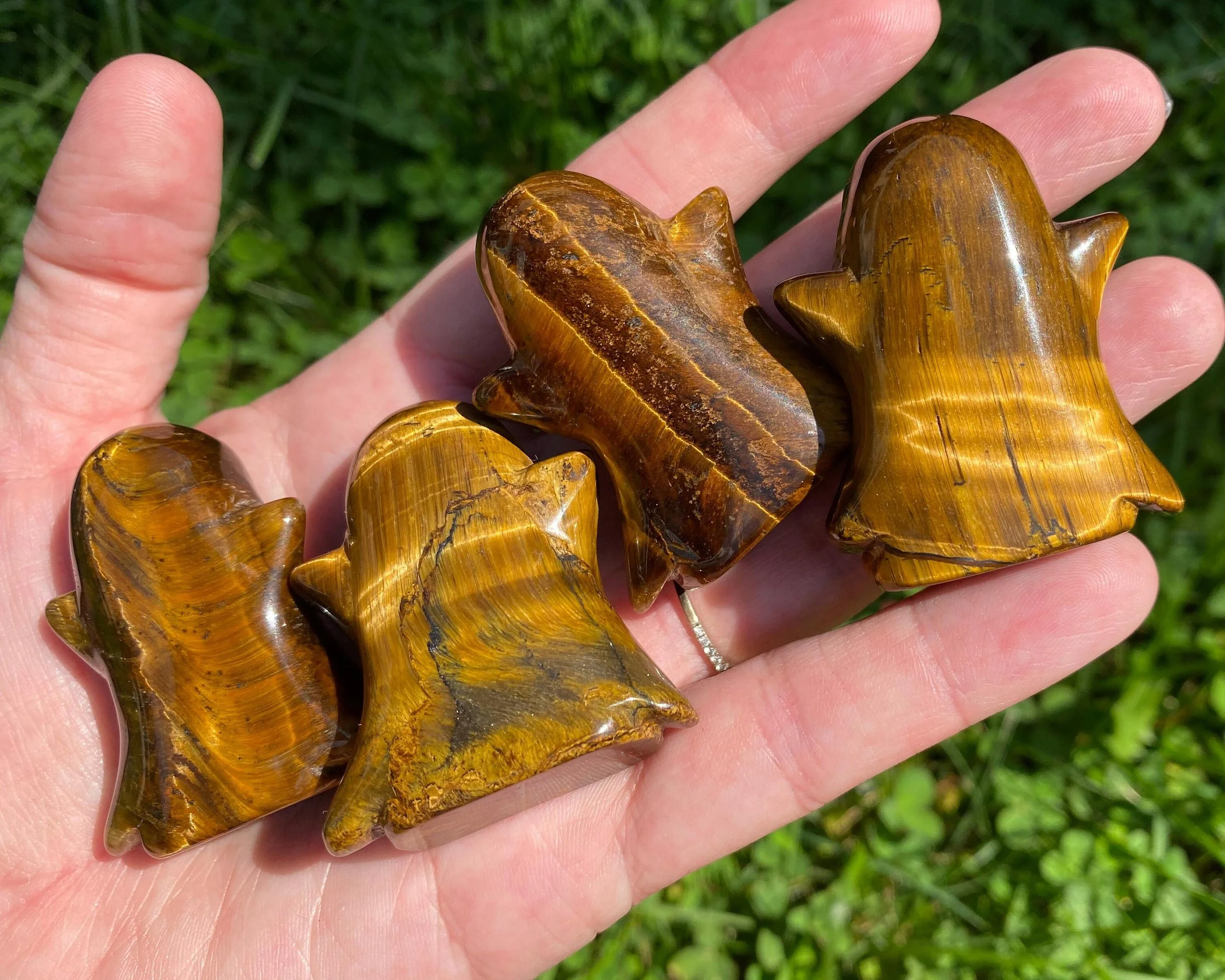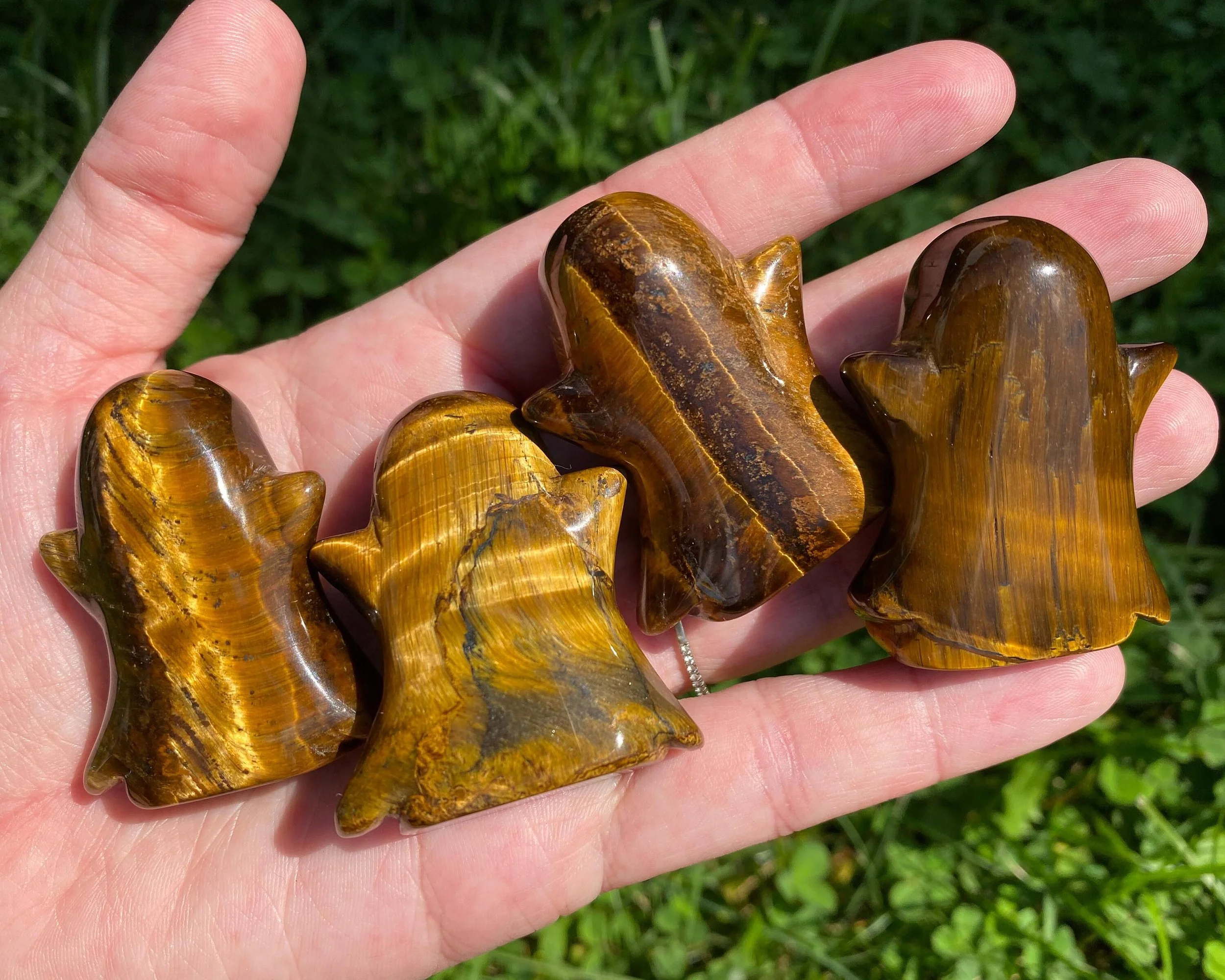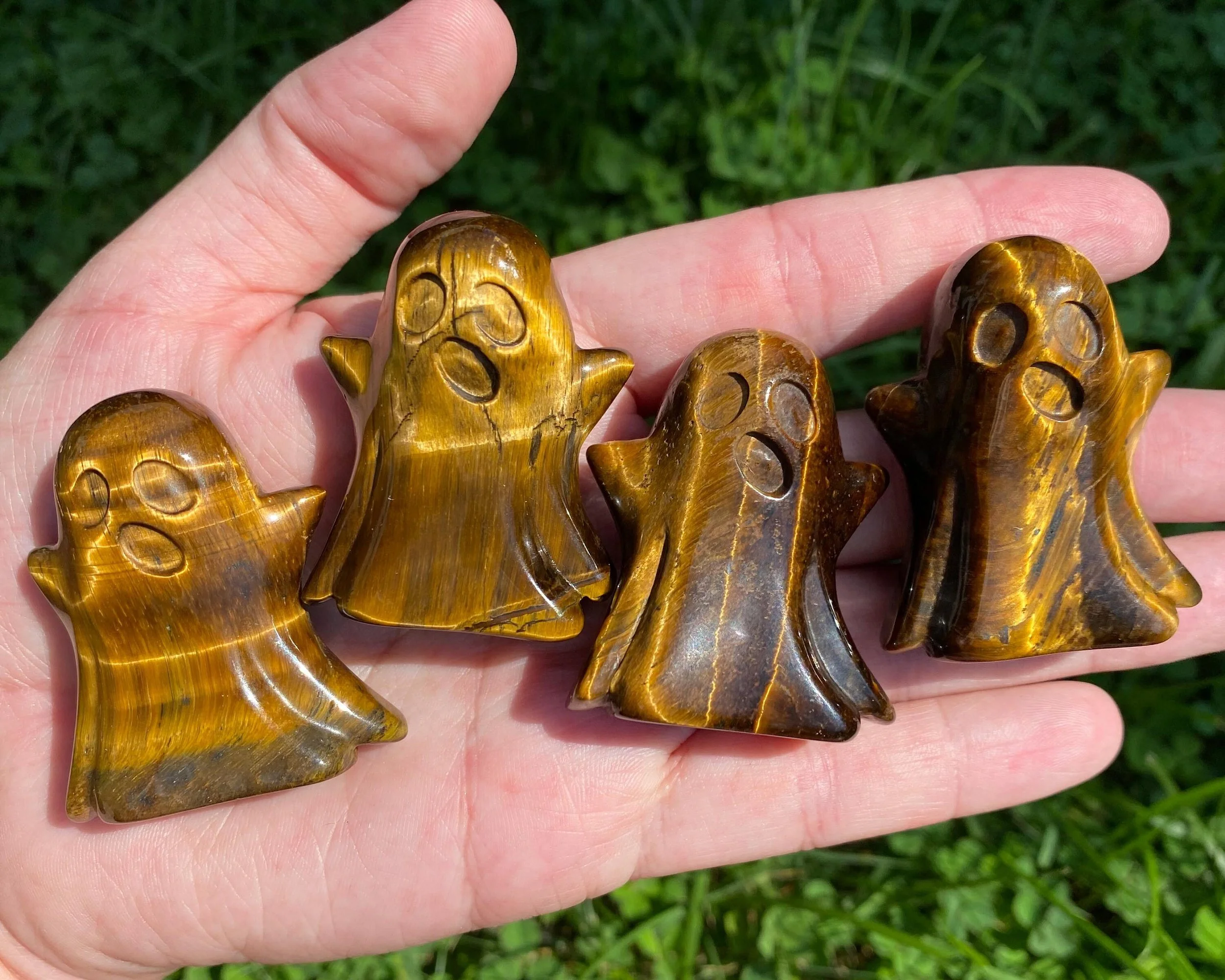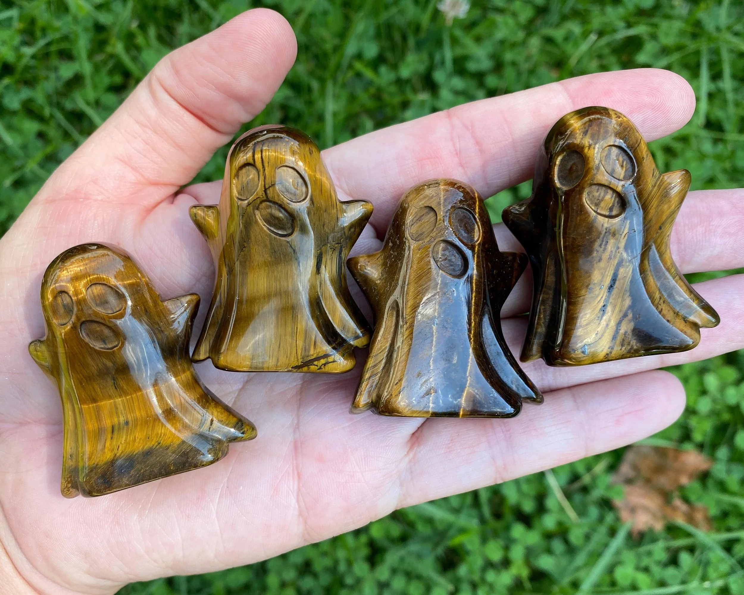 These are cute spooky little ghosts carved from chatoyant Tigers eye. It adds a wonderful touch of Halloween spirit to any space!