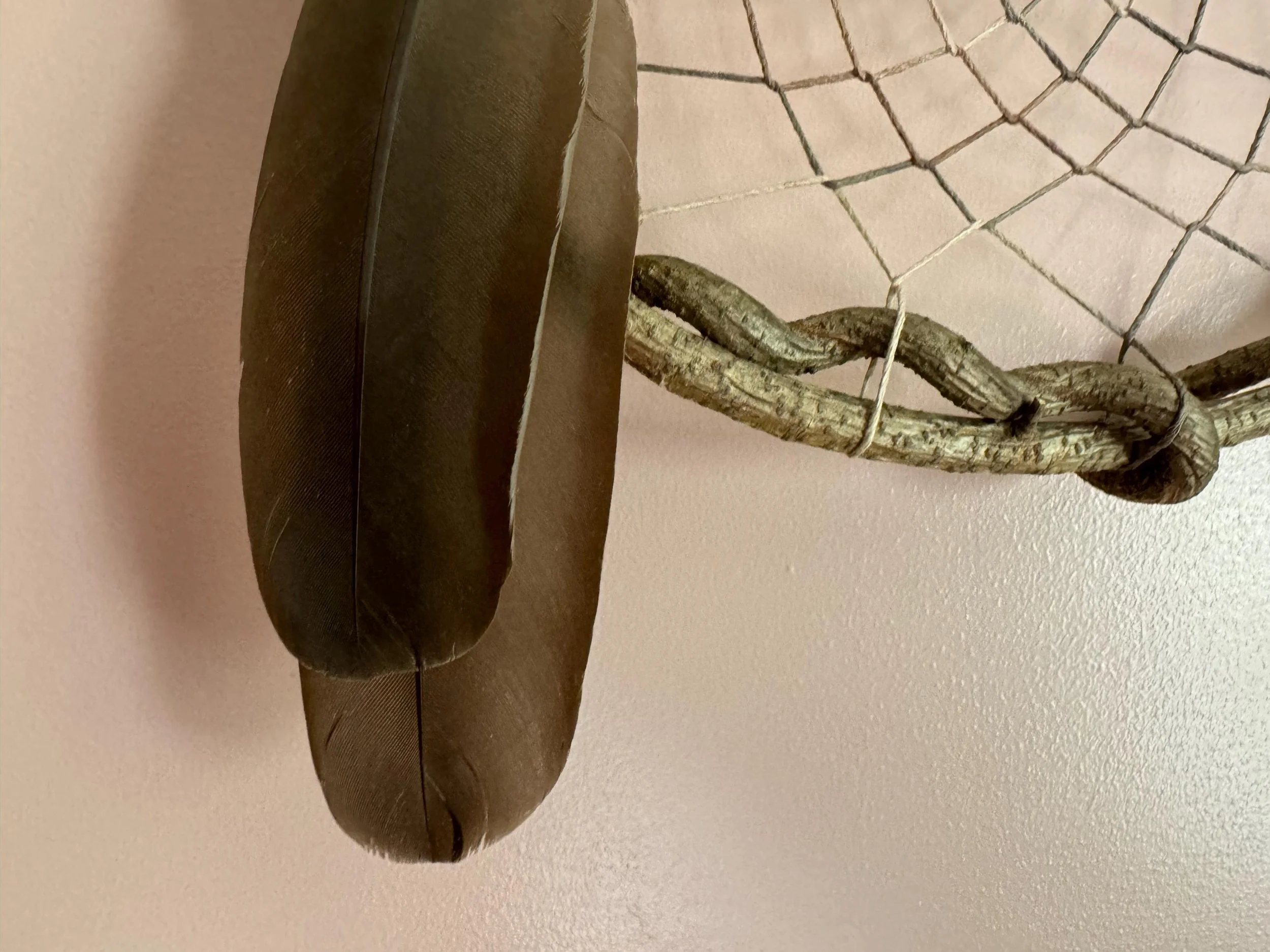 This beautiful dreamcatcher is handmade with invasive vine that grows up into trees in the Lowell-Dracut State Forest, and woven with a hemp that varies from light to dark brown.