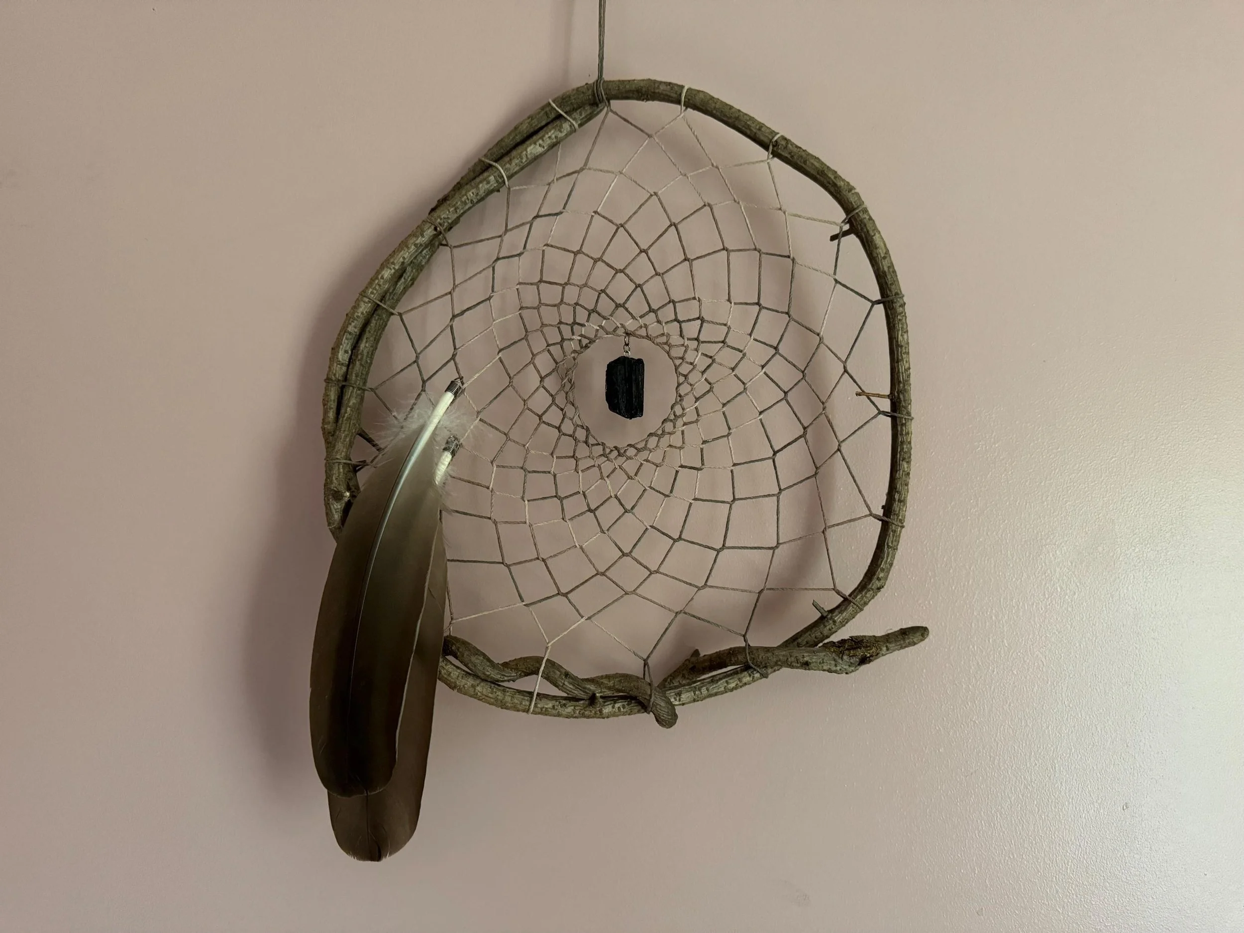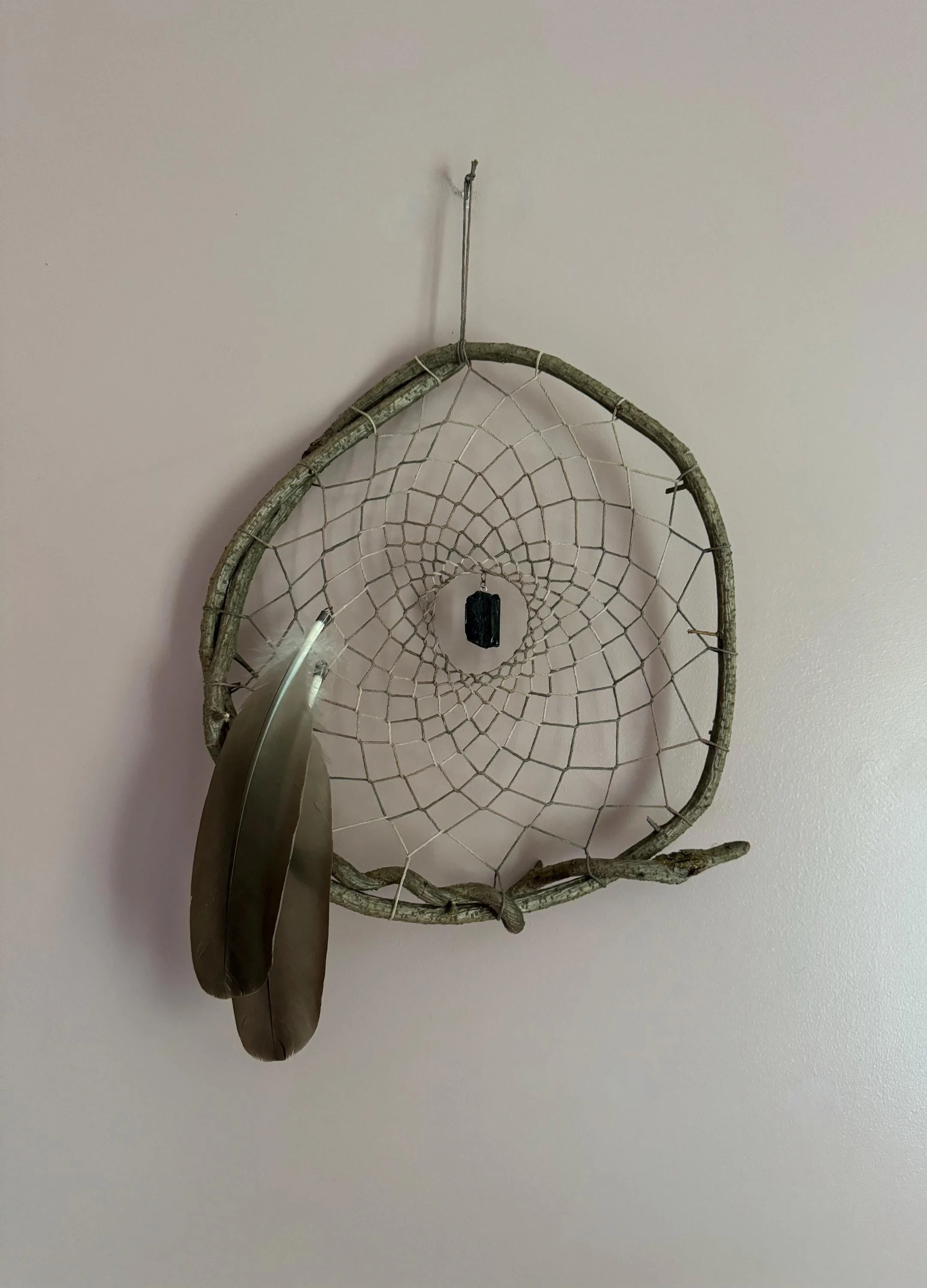 Vine Dream Catcher with Black Tourmaline & Brown Feathers, Wall Hanging, Nature Art, Sacred Geometry, Home Decor, Traditional, Gift for Her
